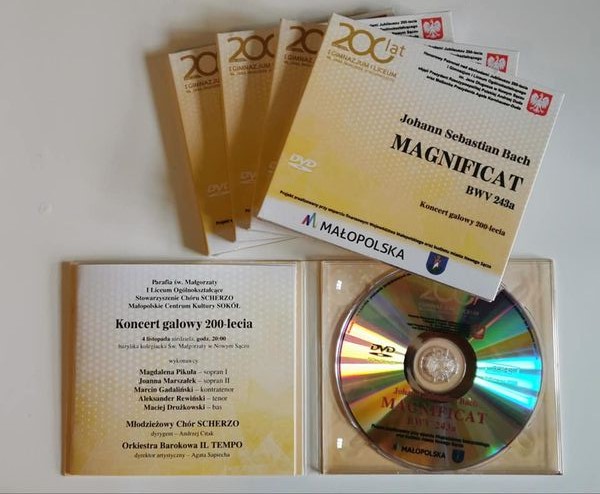 Stowarzyszenie otrzymało również dofinansowanie wydania pierwszej płyty DVD zespołu z nagraniem koncertu jubileuszowego 200-lecia I Gimnazjum i Liceum w Nowym Sączu. Program obejmował wykonanie kompozycji Jana Sebastiana Bacha MAGNIFICAT BWV234a w wykonaniu Młodzieżowego Chóru SCHERZO z towarzyszeniem orkiestry barokowej IL TEMPO z Warszawy, grającej na instrumentach historycznych. Wśród solistów znalazły się m.in. dwie absolwentki chóru i liceum: Magdalena Pikuła i Joanna Marszałek. Koncert odbył się 4 listopada 2018 r. w bazylice kolegiackiej Św. Małgorzaty, w ramach obchodów Jubileuszu 200-lecia I Gimnazjum i Liceum w Nowym.
