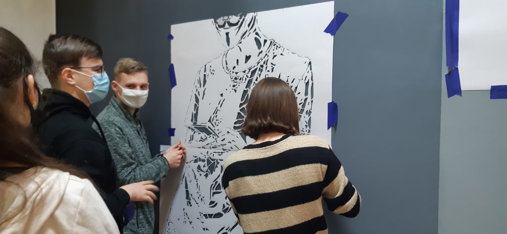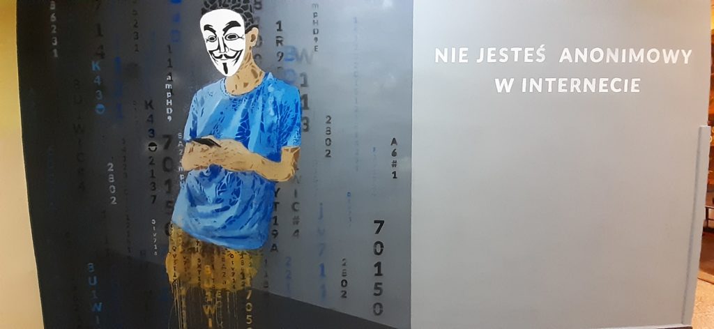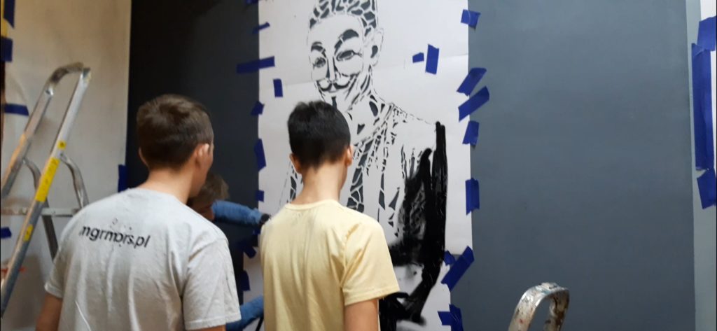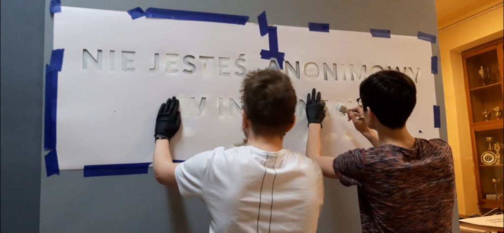 ,,W tle mężczyzny z telefonem pojawiają się cyfry. Nie są jednak przypadkowe. Tak naprawdę to są nasze kody. Ukryliśmy tam ważne dla nas daty, a nawet imiona. To będzie też pamiątka, która w tej szkole po nas zostanie. To nasza graficzna tożsamość zapisana na ścianie. Jednak najistotniejsza jest idea, która nam przyświecała, mianowicie fakt , że w Internecie nikt nie jest anonimowy. Wysyłane informacje zostają w wirtualnej przestrzeni”.
