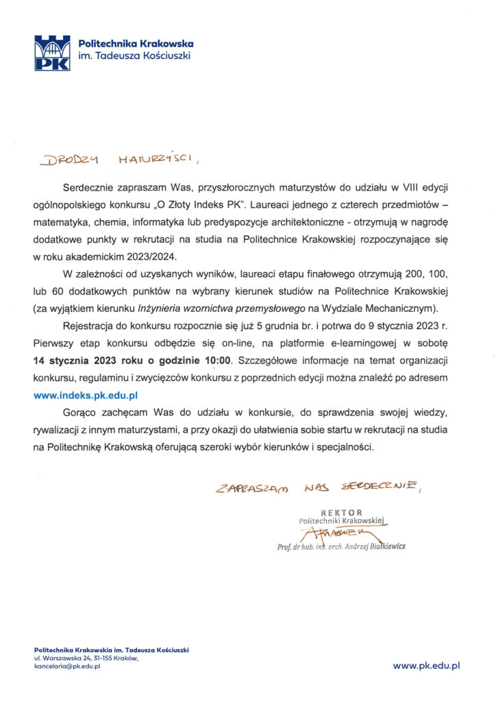 W załączeniu wiadomości znajdują się zaproszenie do udziału w rywalizacji „O Złoty Indeks PK”, które do maturzystów skierował Rektor Politechniki Krakowskiej prof. Andrzej Białkiewicz oraz plakat konkursu.