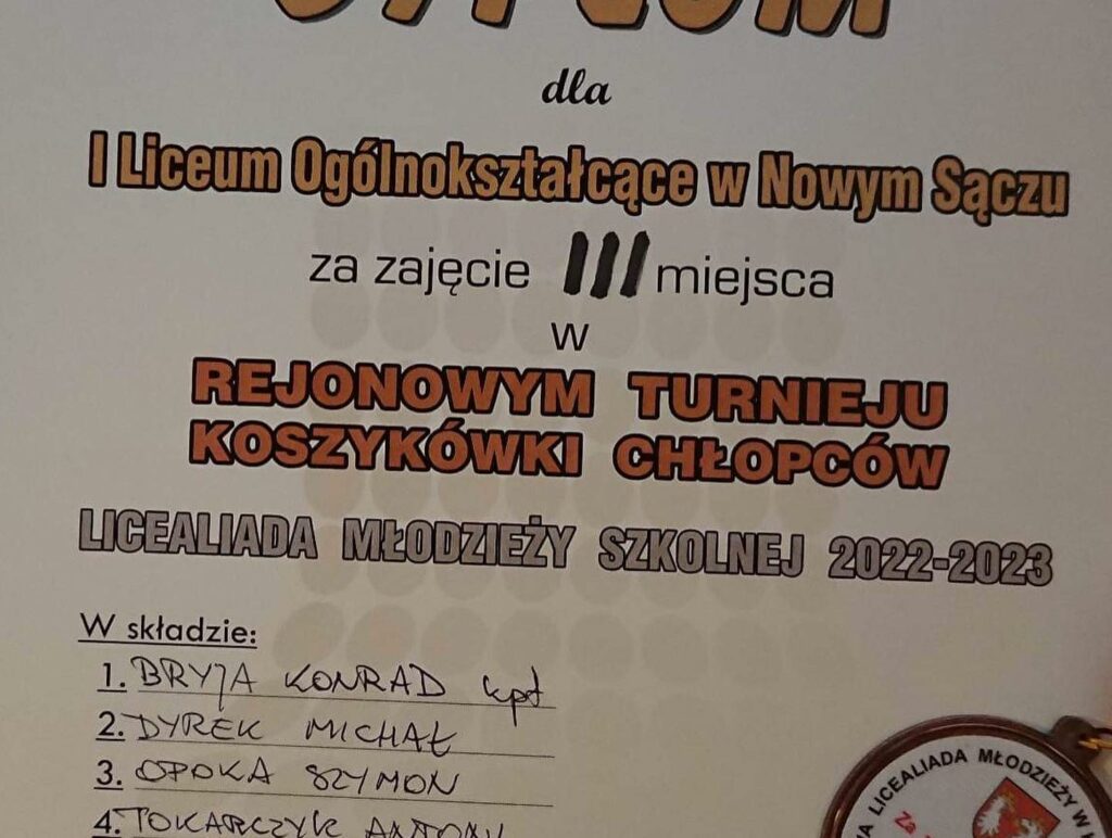 MIEJSCE !!!Skład reprezentacji :KONRAD BRYJA 4D (19) kpt.MICHAŁ DYREK 4G (22)SZYMON OPOKA 2 I (21)ANTONI TOKARCZYK 1A (15)KACPER WACHEL 3B (25)SŁAWOMIR SZKARŁAT 3B (18)BARTOSZ FLORKOWSKI 1d (17)MICHAŁ RĄCZKA 3B (16)JAKUB PRYMA 4G (20)