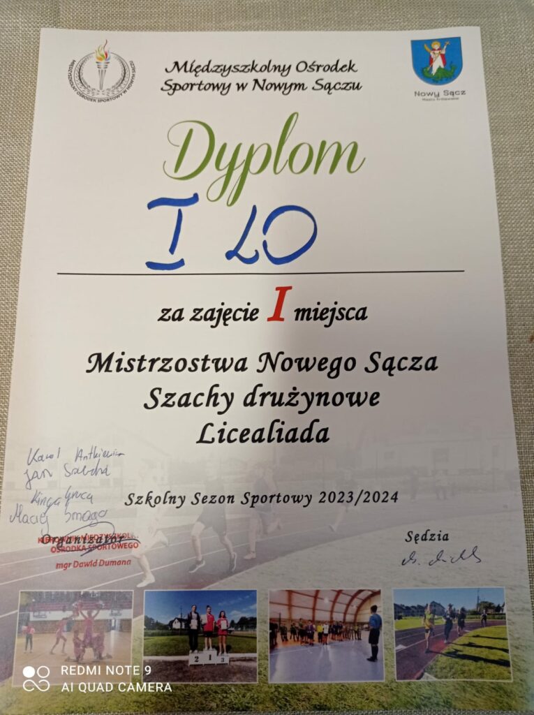 Dnia 23X 2023r odbyły się Mistrzostwa Nowego Sącza w szachach drużynowych. Niezawodna reprezentacja naszej szkoły zdobyła 1 miejsce!!!🥇🏆i tym samym zawodnicy stali się Mistrzami Nowego Sącza 👍 szkół średnich.