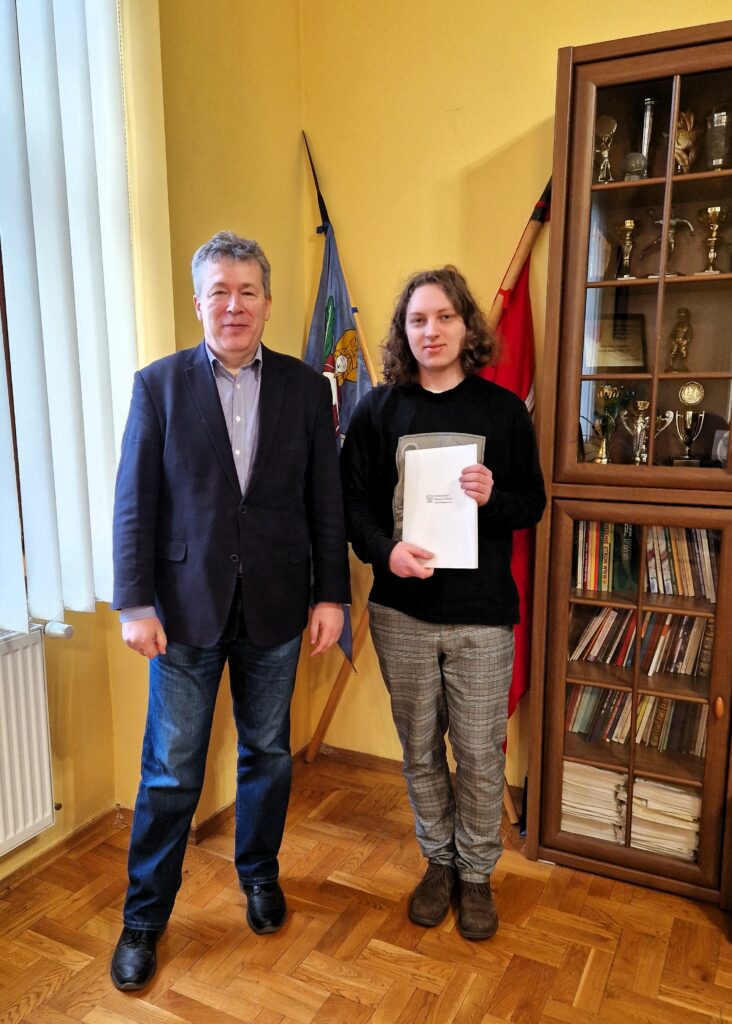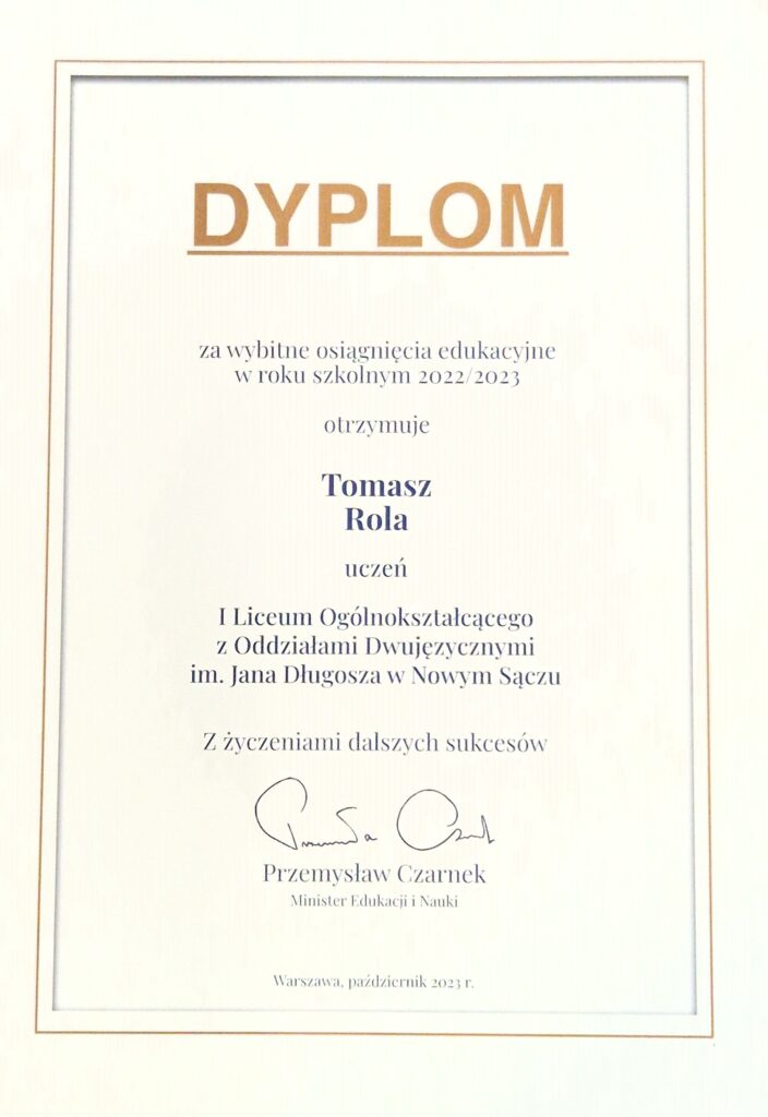 W dniu 4 stycznia 2024 r. naszą szkołę odwiedził wybitny Absolwent – Tomasz Rola, zwycięzca olimpiad przedmiotowych: LIII Olimpiady Literatury i Języka Polskiego oraz XXXV Olimpiady Filozoficznej w roku szkolnym 2022/2023. Był to pierwszy przypadek w historii udziału naszej szkoły w olimpiadach przedmiotowych, kiedy w tym samym dniu uczeń wygrał dwa etapy centralne. Opiekę nad laureatem dwóch olimpiad przedmiotowych sprawowała mgr Małgorzata Szewczuk. Dyrektor Jacek Tomasik przekazał Absolwentowi w imieniu Małopolskiego Kuratora Oświaty, gratulacje oraz życzenia dalszych sukcesów podczas studiów na Uniwersytecie Jagiellońskim wraz z informacją o przyznaniu stypendium Ministra Edukacji i Nauki.