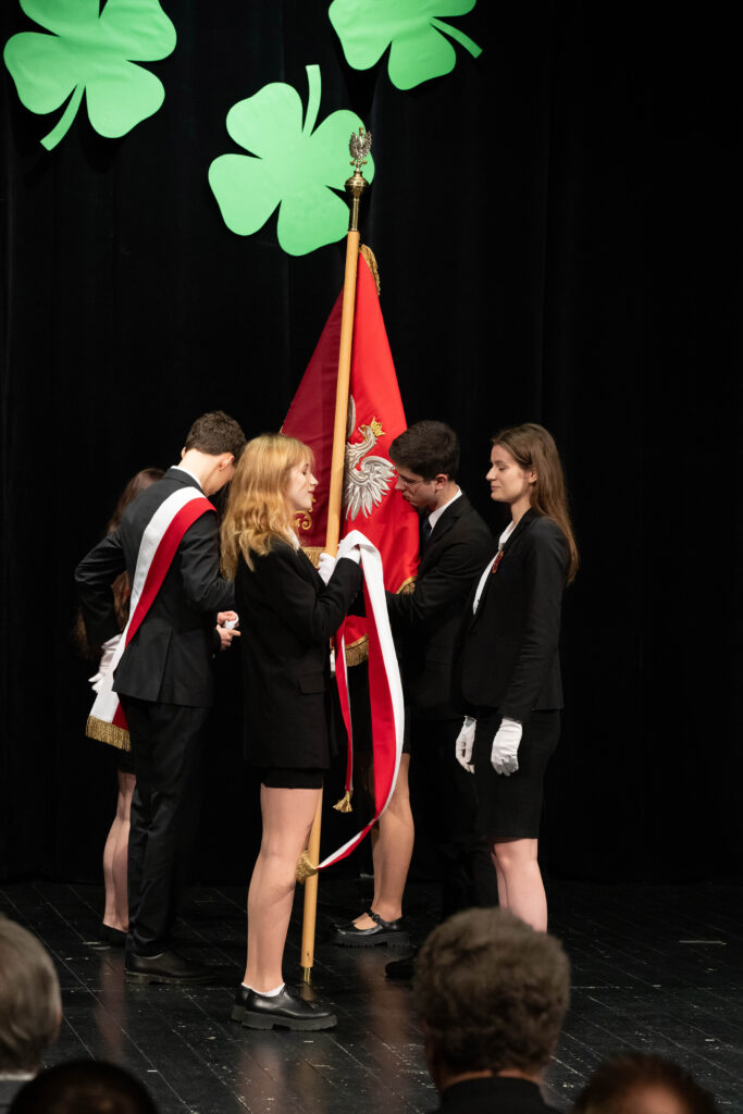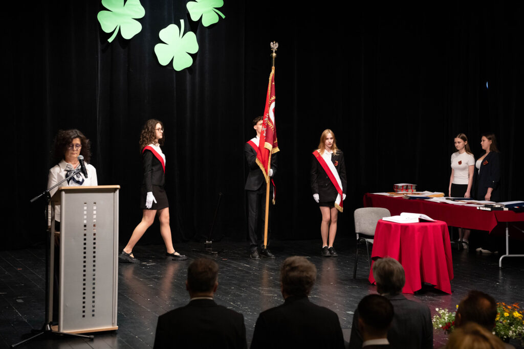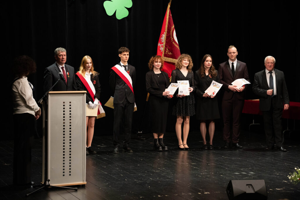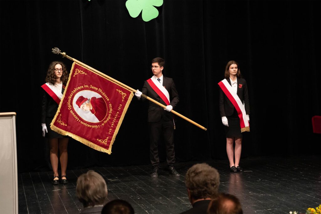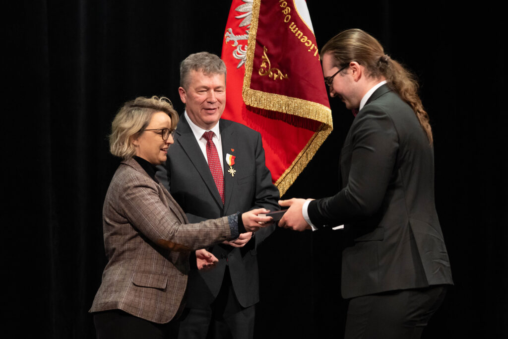 Justyna Szmit z klasy 4d, Anna Porębska z klasy 4i oraz Patryk Franczak z klasy 4e – reprezentanci Pocztu Sztandarowego. Oprócz dyplomu i nagrody wyróżnieni otrzymali odznaczenie – tarczę szkoły.