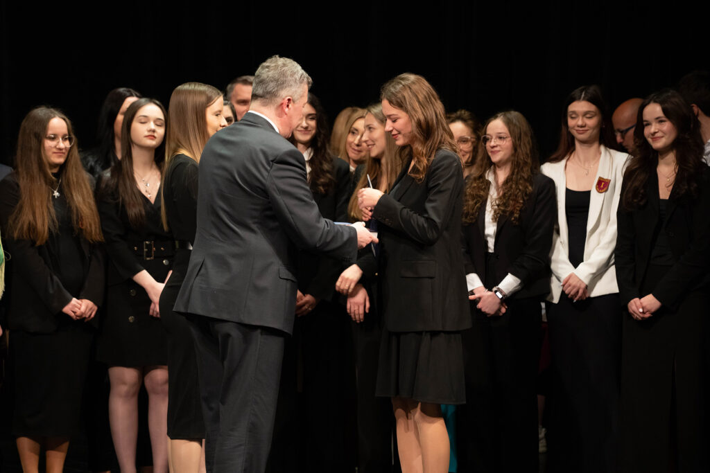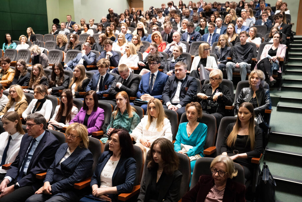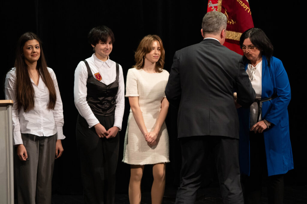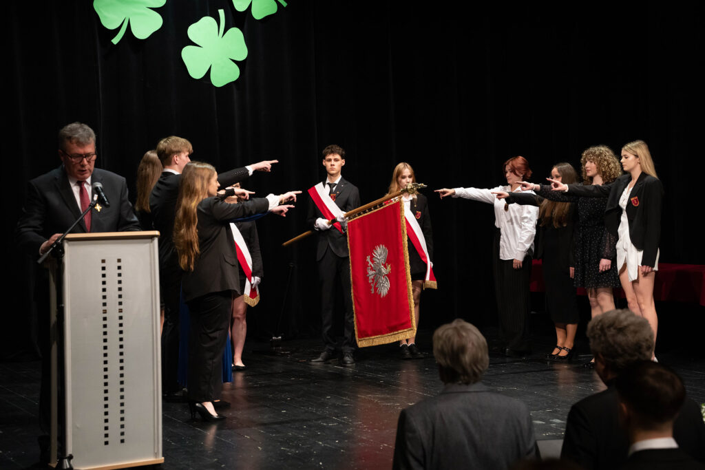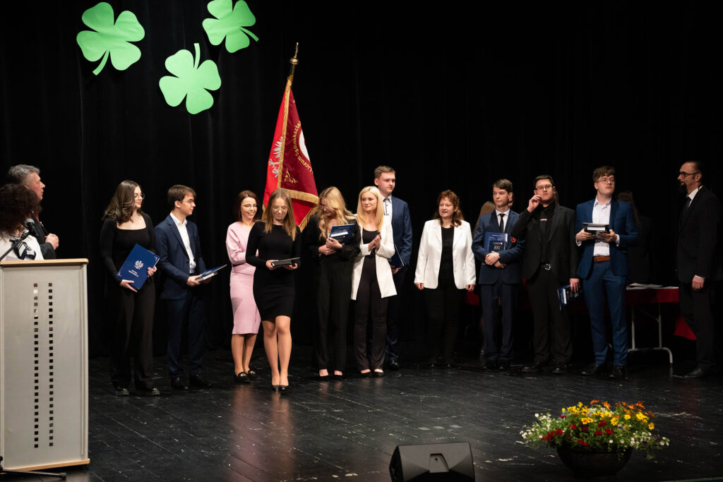 Justyna Szmit z klasy 4d, Anna Porębska z klasy 4i oraz Patryk Franczak z klasy 4e – reprezentanci Pocztu Sztandarowego. Oprócz dyplomu i nagrody wyróżnieni otrzymali odznaczenie – tarczę szkoły.
