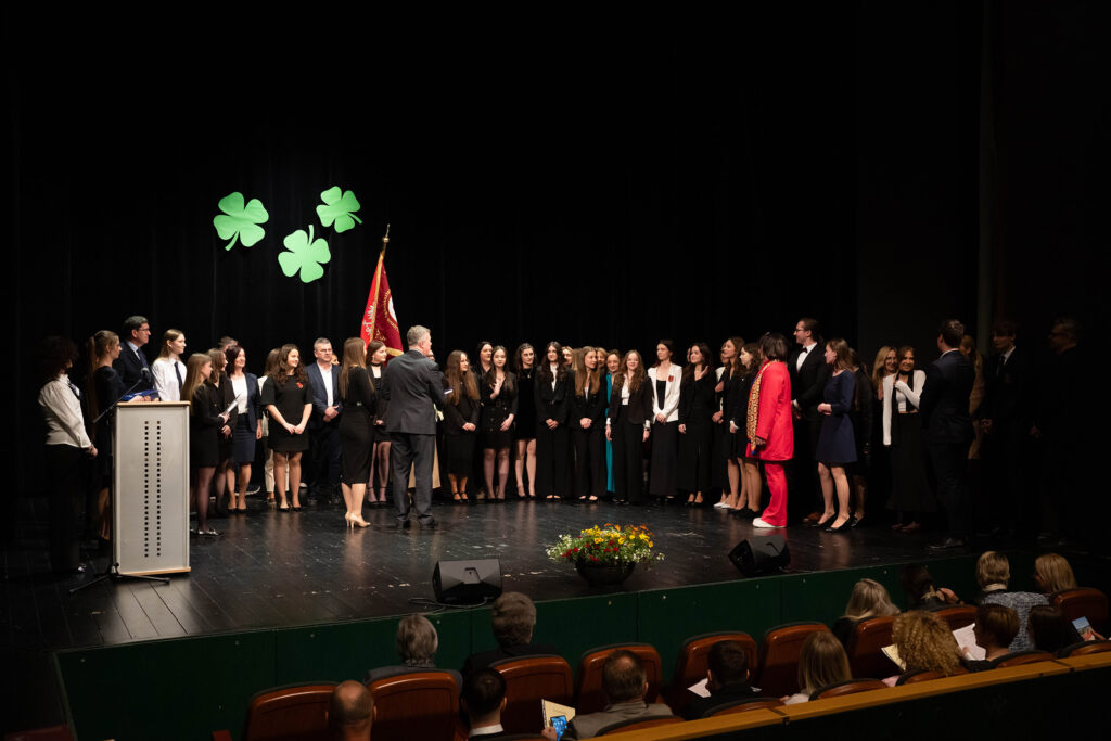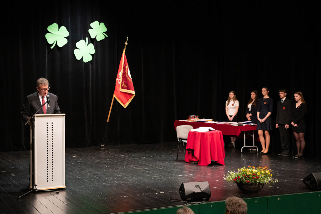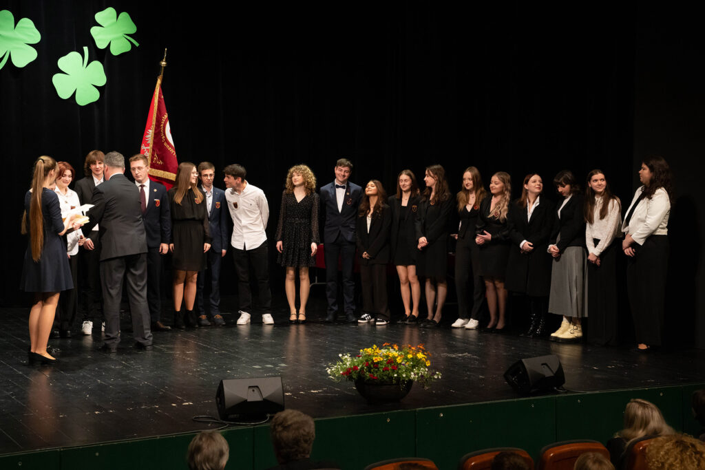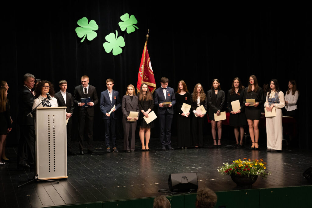 26 kwietnia b.r. odbyła się uroczystość pożegnania absolwentów naszej szkoły, na którą przybyli: dyrekcja, wychowawcy, nauczyciele, absolwentki i absolwenci oraz ich rodzice. Serdeczne słowa życzeń do uczniów kończących naukę w I LO skierowali: dyrektor szkoły Pan Jacek Tomasik, przedstawicielka Rady Rodziców Pani Magdalena Woźniak oraz Przewodnicząca Samorządu Uczniowskiego Natalia Szczepaniak. Przemawiający życzyli absolwentom najlepszych wyników egzaminów maturalnych, spełnienia marzeń i życiowych sukcesów. Tomasz Sowa, w imieniu absolwentów, podziękował dyrekcji, wychowawcom i nauczycielom za ich pracę, przekazywaną wiedzę, serdeczność i codzienne wsparcie oraz koleżankom i kolegom za miły, wspólnie spędzony w szkole czas. Dyrektor szkoły przekazał listy gratulacyjne rodzicom absolwentów, którzy ukończyli I LO z wyróżnieniem oraz serdecznie podziękował rodzicom zaangażowanym w pracę na rzecz szkoły. Absolwenci złożyli ślubowanie na sztandar szkoły oraz przekazali go – zgodnie z tradycją – młodszym uczniom.