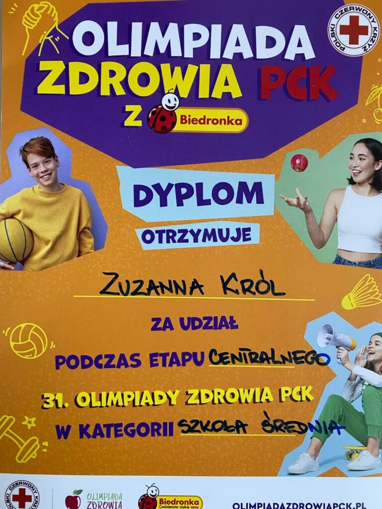 W dniach 24-26 maja w Łodzi miał miejsce ostatni etap ogólnopolski OLIMPIADY ZDROWIA PCK z Biedronką, w której uczennica klasy 2B Zuzanna Król wzięła udział. Na tym poziomie był do rozwiązania test składający się z 100 pytań, oraz przedstawienie swojej akcji promocyjnej przed komisją. Zuzanna uzyskała 2 wynik z testu, jej praca również została wysoko oceniona, co sprawiło, że zajęła 8 miejsce wśród uczestników z całej Polski.