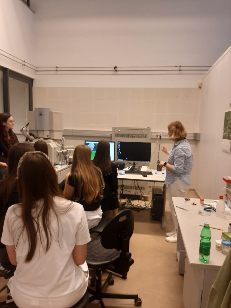 W laboratorium obserwowali strukturą różnych materiałów biologicznych np. zębów, kości, muszli itp. Mieli też możliwość zobaczyć jak projektuje się i bada różne struktury inspirowane naturą np. implanty.