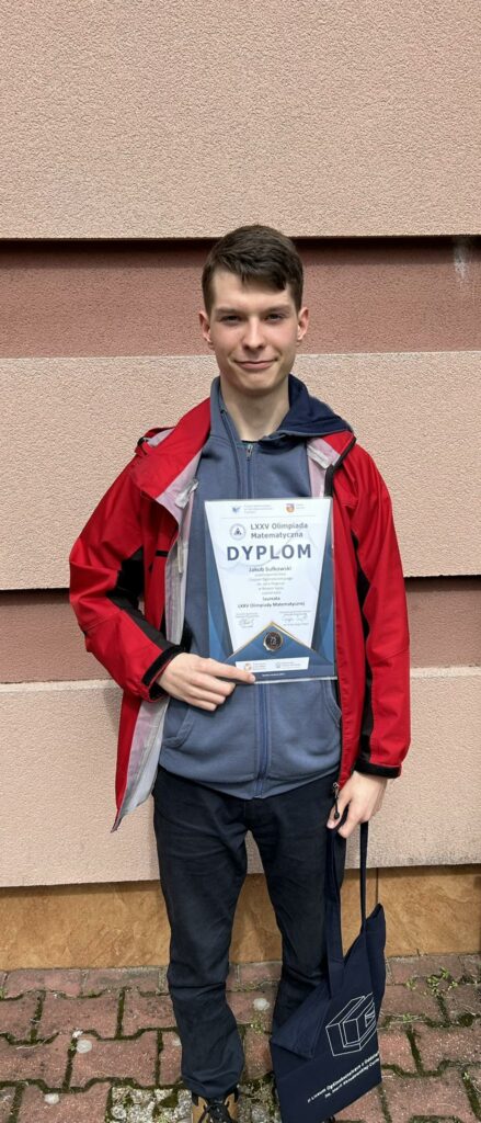 Wielki sukces ucznia naszej Szkoły – Jakub Sułkowski z klasy 4g został laureatem LXXV Olimpiady Matematycznej! Oznacza to, że Kuba jest wśród 30 najlepszych uczniów z całej Polski, a równocześnie pierwszym laureatem Olimpiady Matematycznej w historii naszej szkoły! Podczas dwóch dni finałowego etapu olimpiady, który odbył się Końskich (woj.świętokrzyskie) w dniach 3-4 kwietnia 2024 roku, 215 najlepszych uczniów z kraju każdego dnia miało do rozwiązania po 3 zadania w ciągu 5 godzin, a są to zadania z zakresu matematyki na poziomie akademickim.
