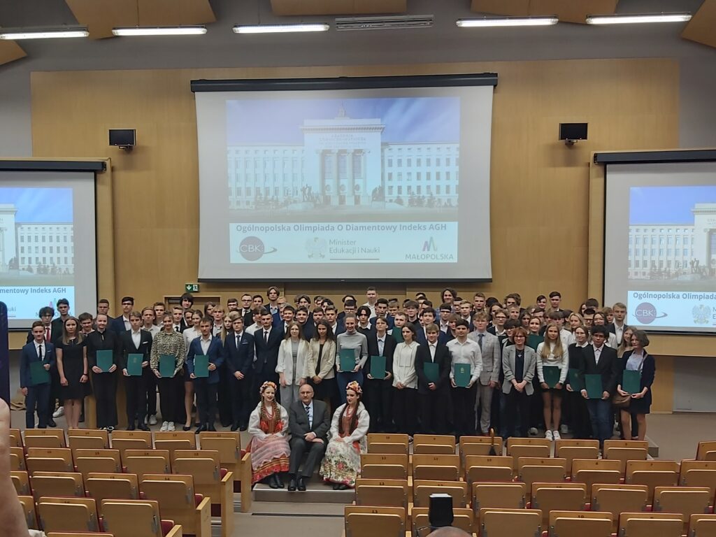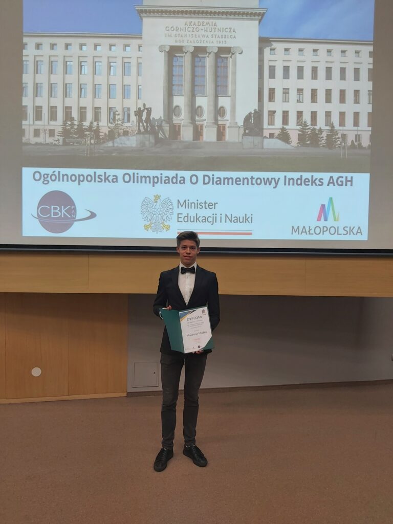 W dniu 12 czerwca 2024 roku miało miejsce uroczyste zakończenie XVII Ogólnopolskiej Olimpiady o Diamentowy Indeks AGH. W uroczystej gali uczestniczył Mateusz Mółka z kl 2b, który uzyskał tutuł laureata I stopnia w dziedzinie chemii. Odebrał On dyplom z gratulacjami od dr hab. prof. AGH Jerzego Stochela – Przewodniczącego Komitetu Głównego Ogólnopolskiej Olimpiady o Diamentowy Indeks AGH oraz prof. dr hab. inż. Wojciecha Łużnego – Prorektora ds. Kształcenia.