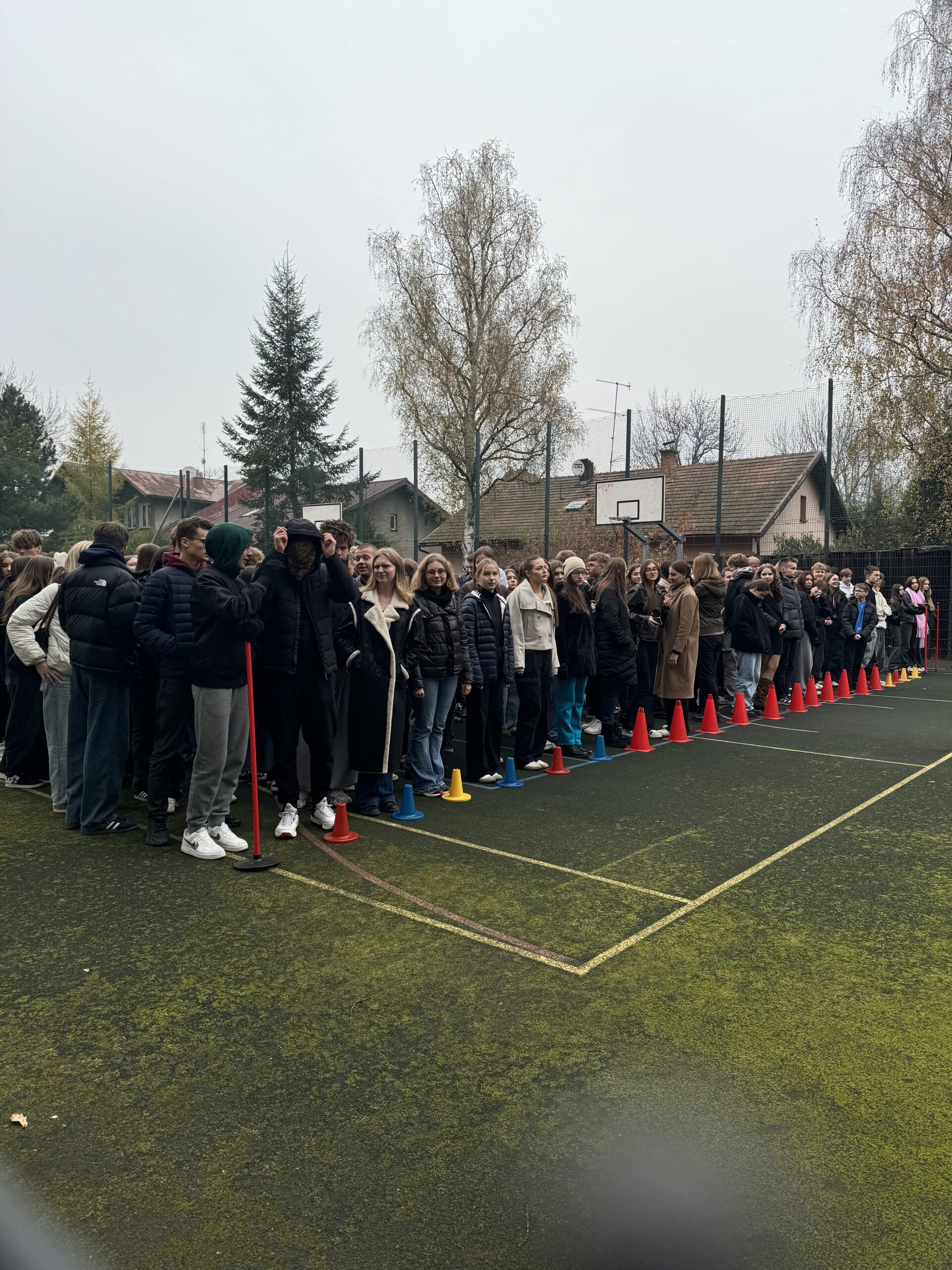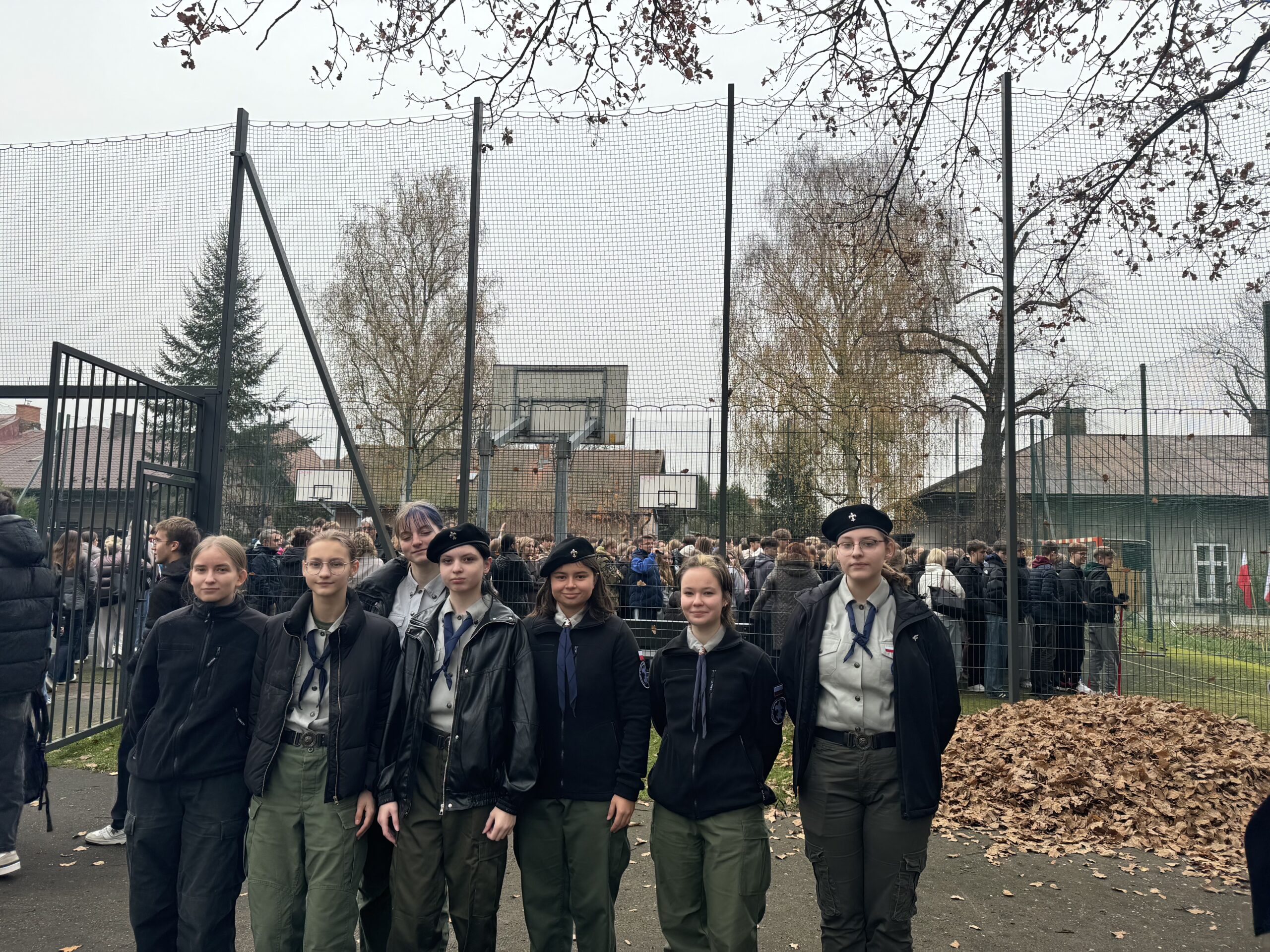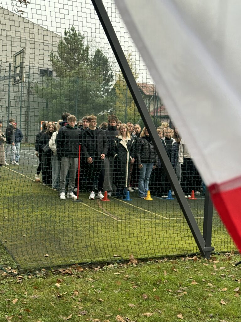 Punktualnie o godzinie 11:11 cała społeczność szkolna zebrała się na boisku. Mimo chłodnego, listopadowego poranka atmosfera była pełna ciepła i wspólnotowego ducha. Wszyscy z dumą stanęli, by wspólnie odśpiewać „Mazurka Dąbrowskiego” – symbol naszej narodowej tożsamości.