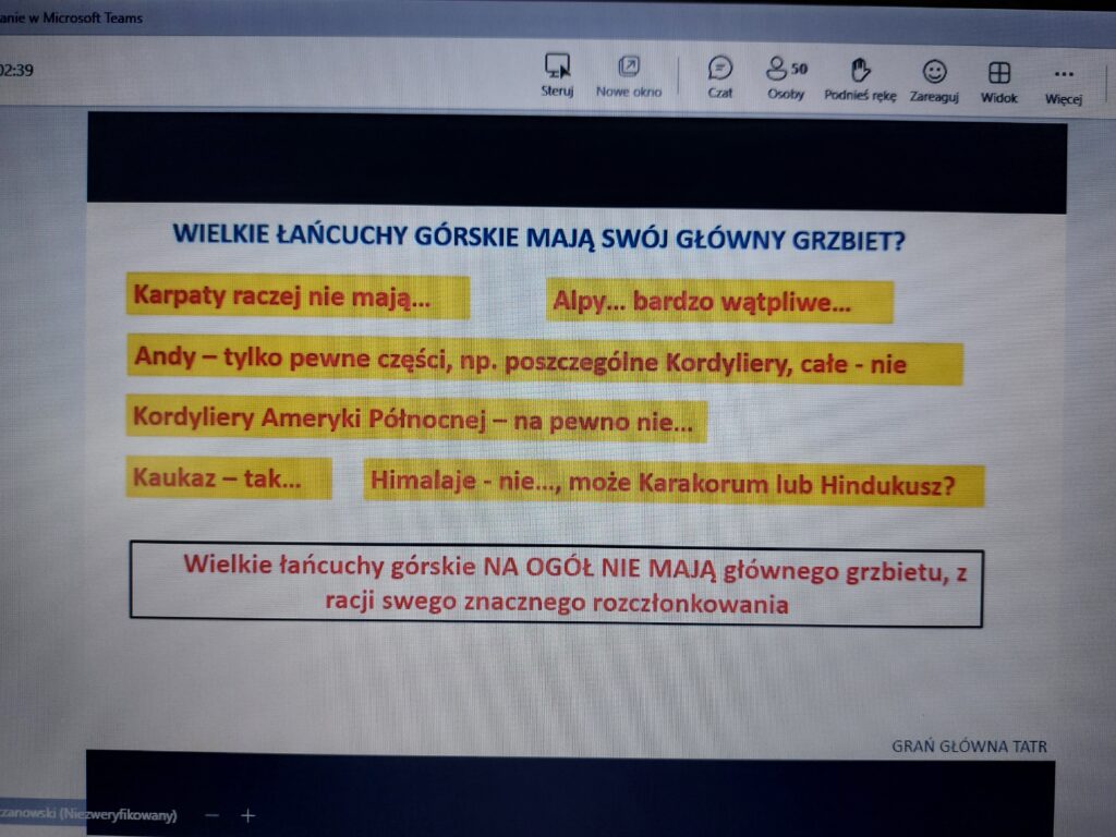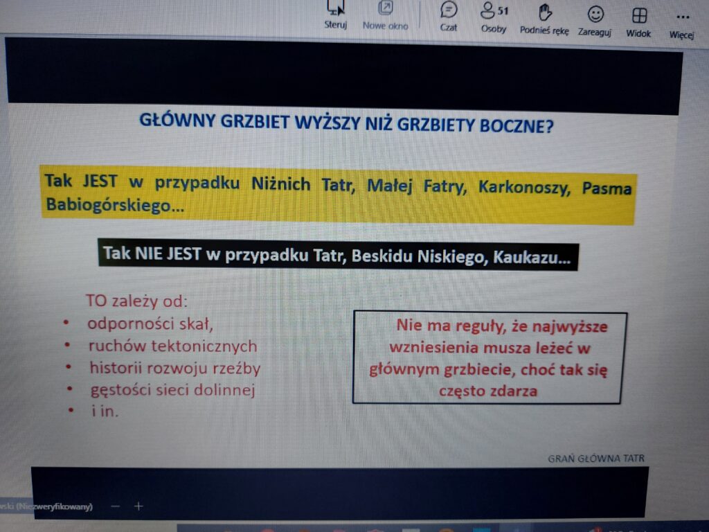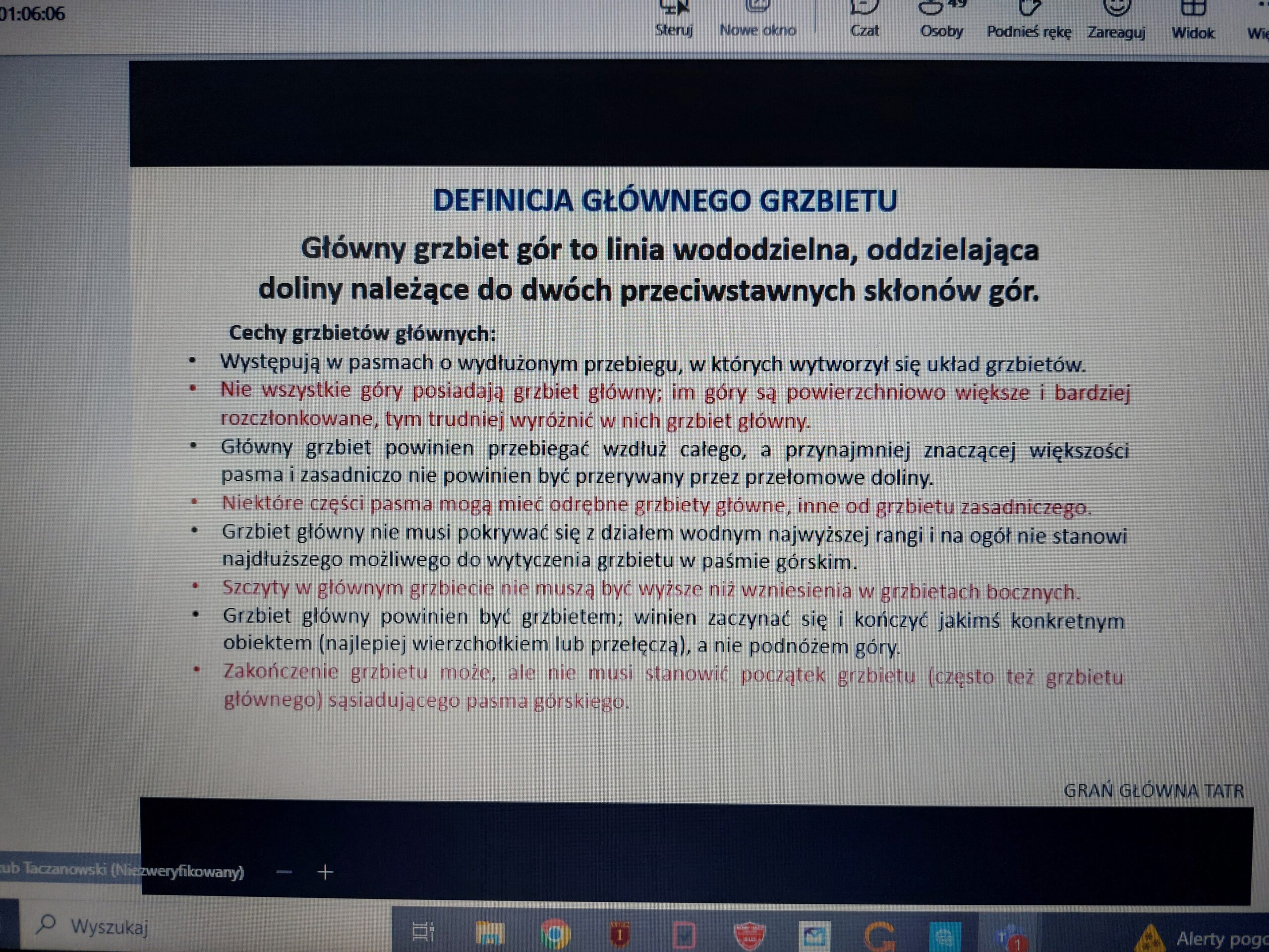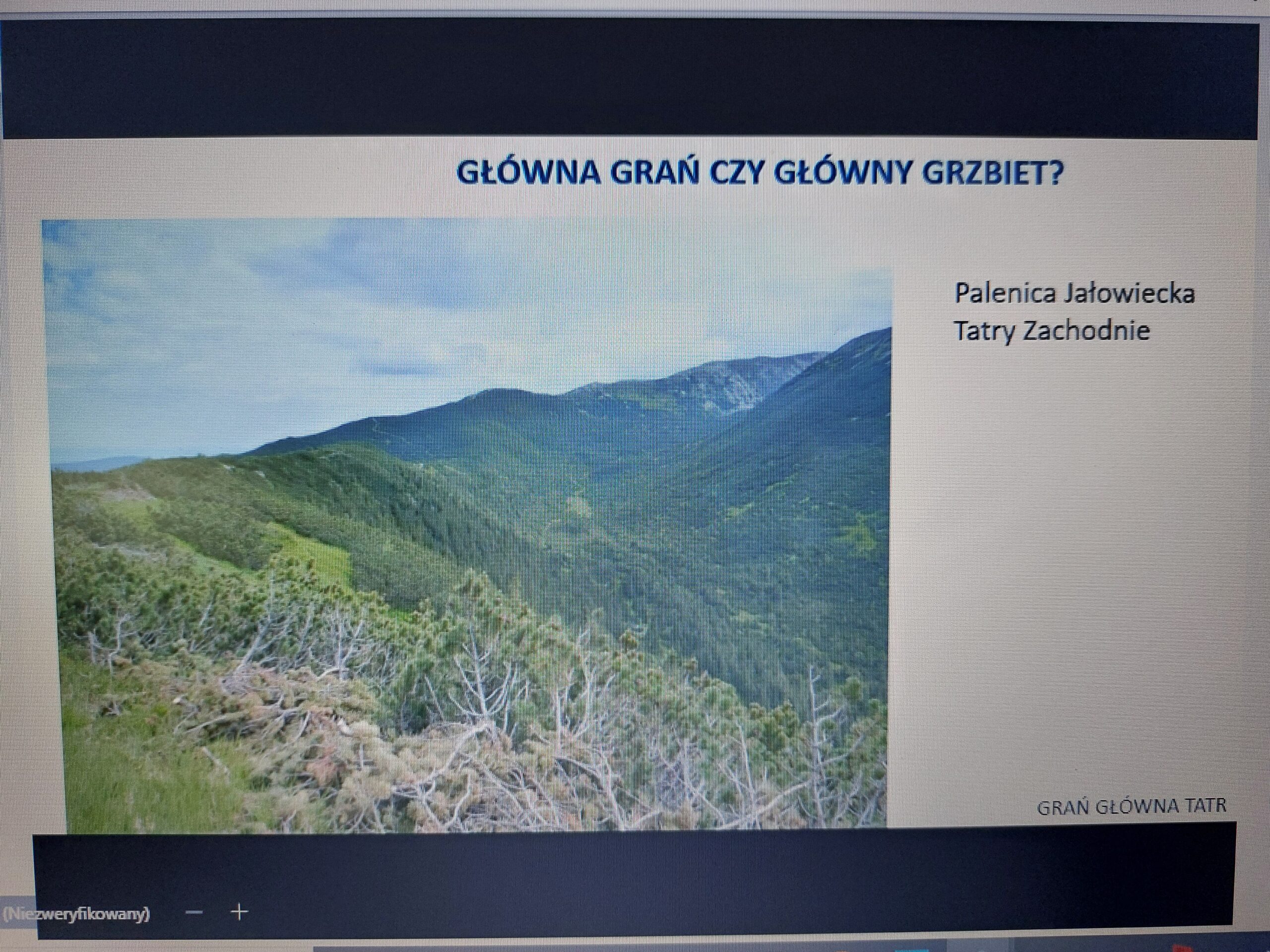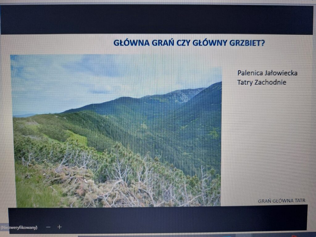 12 listopada 2024 roku uczniowie realizujący zakres rozszerzony geografii (2i, 3e, 4i), uczestniczyli w ramach współpracy I LO w oparciu o umowę partnerską z Instytutem Geografii i Gospodarki Przestrzennej UJ w Krakowie w kolejnym odczycie popularnonaukowym i dyskusji na temat :„Główna grań Tatr oczami krytycznego geografa”, poprowadzonej przez profesora Jarosława Balona (IGiGP UJ).