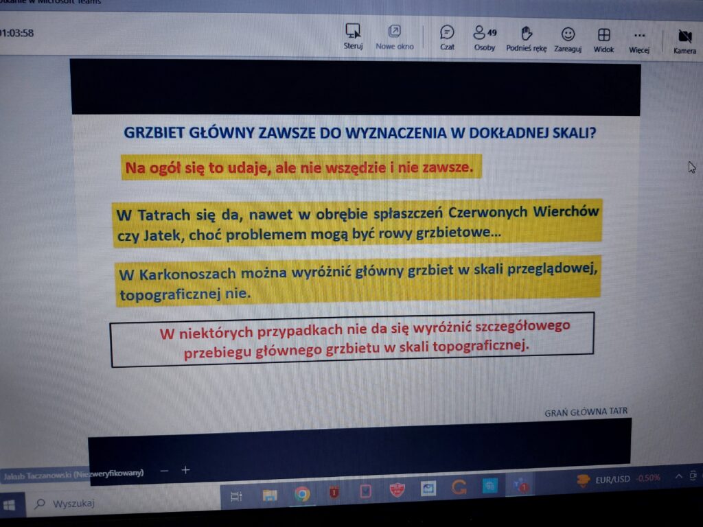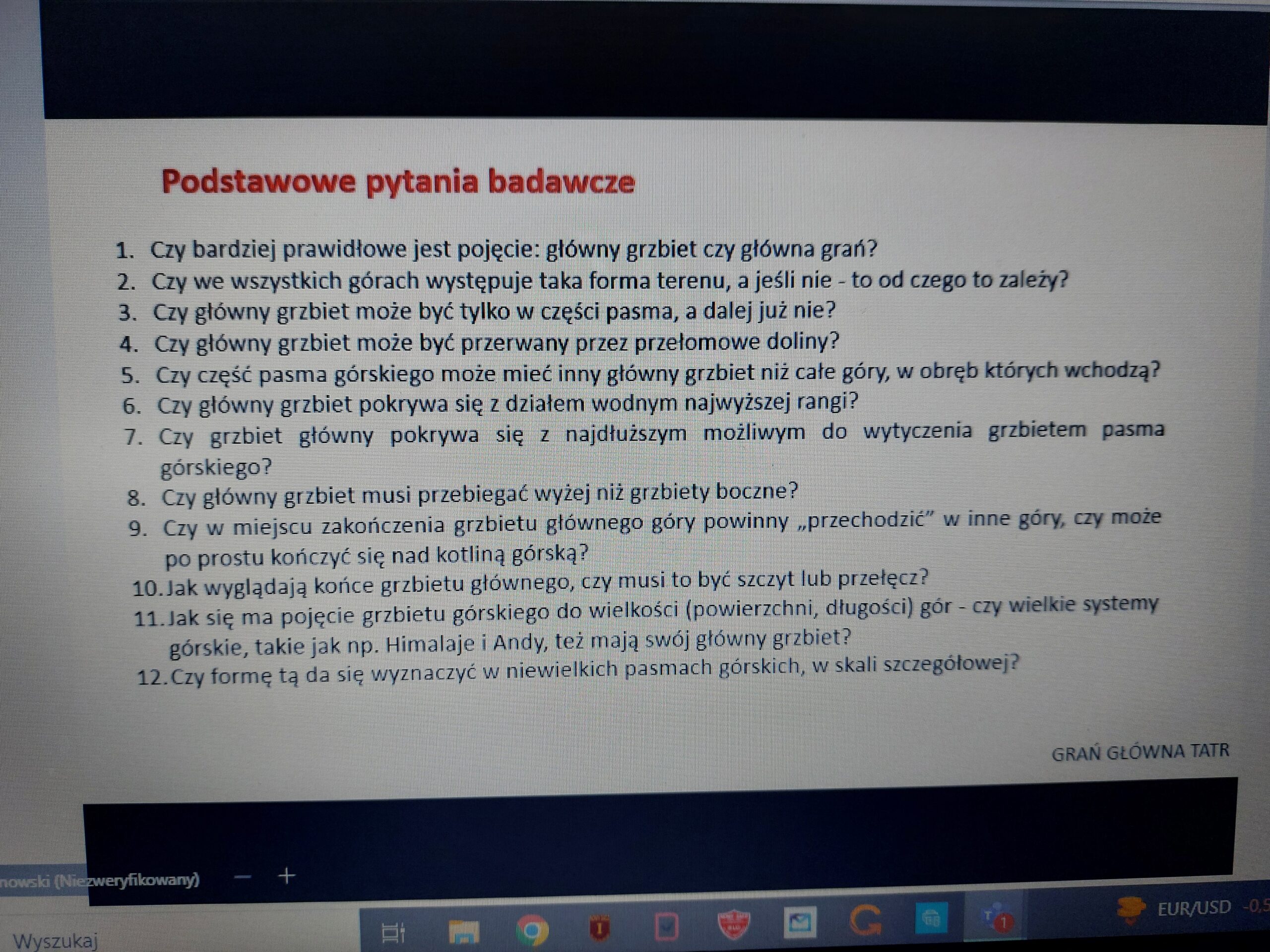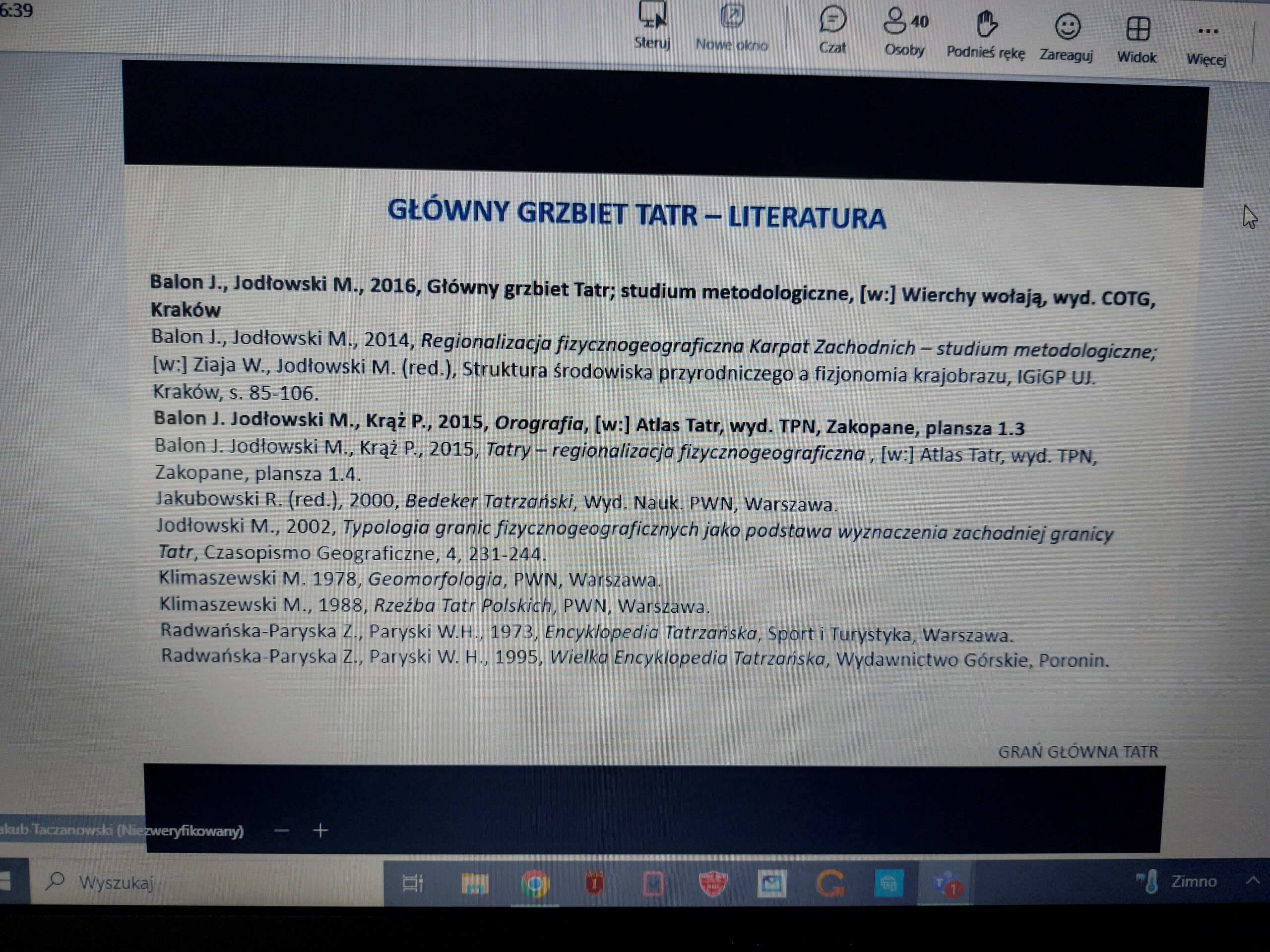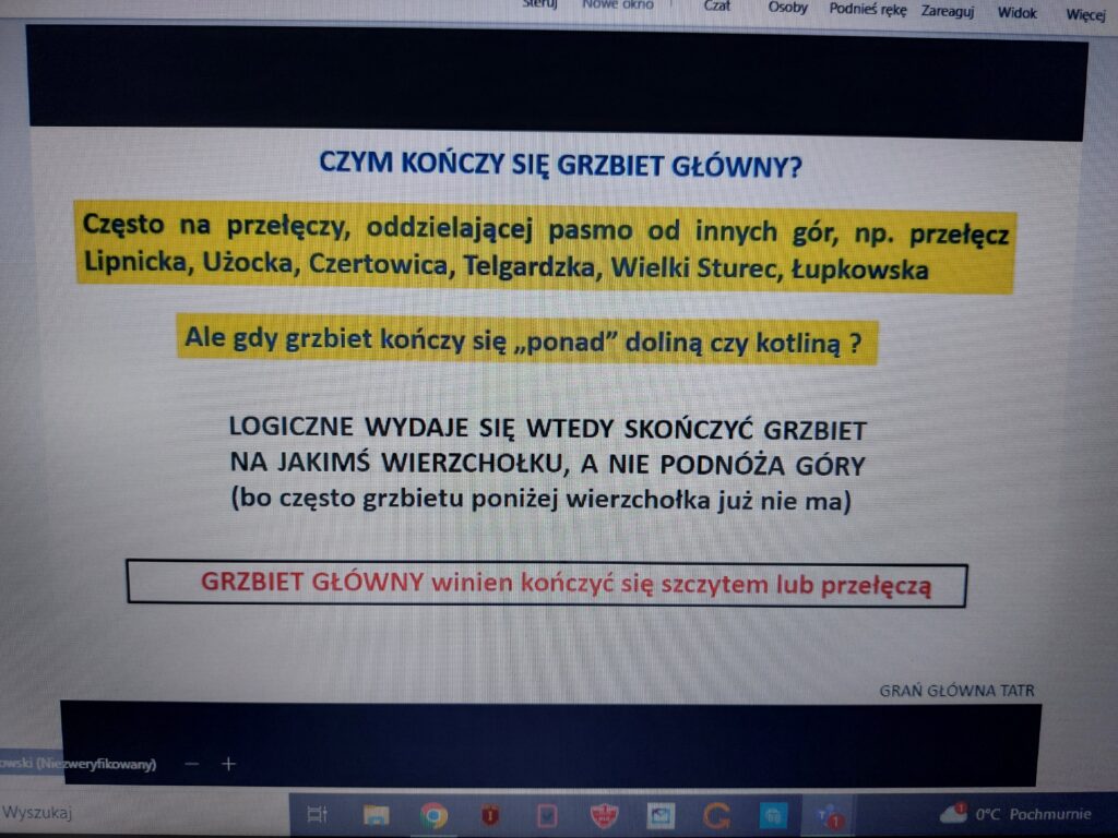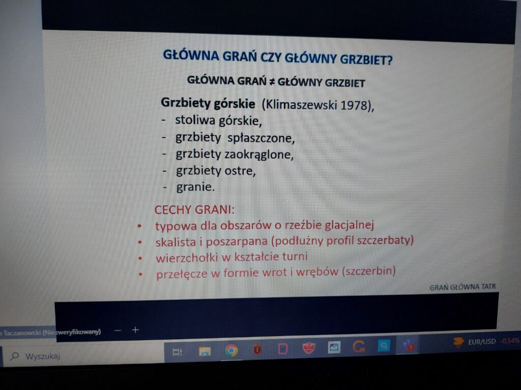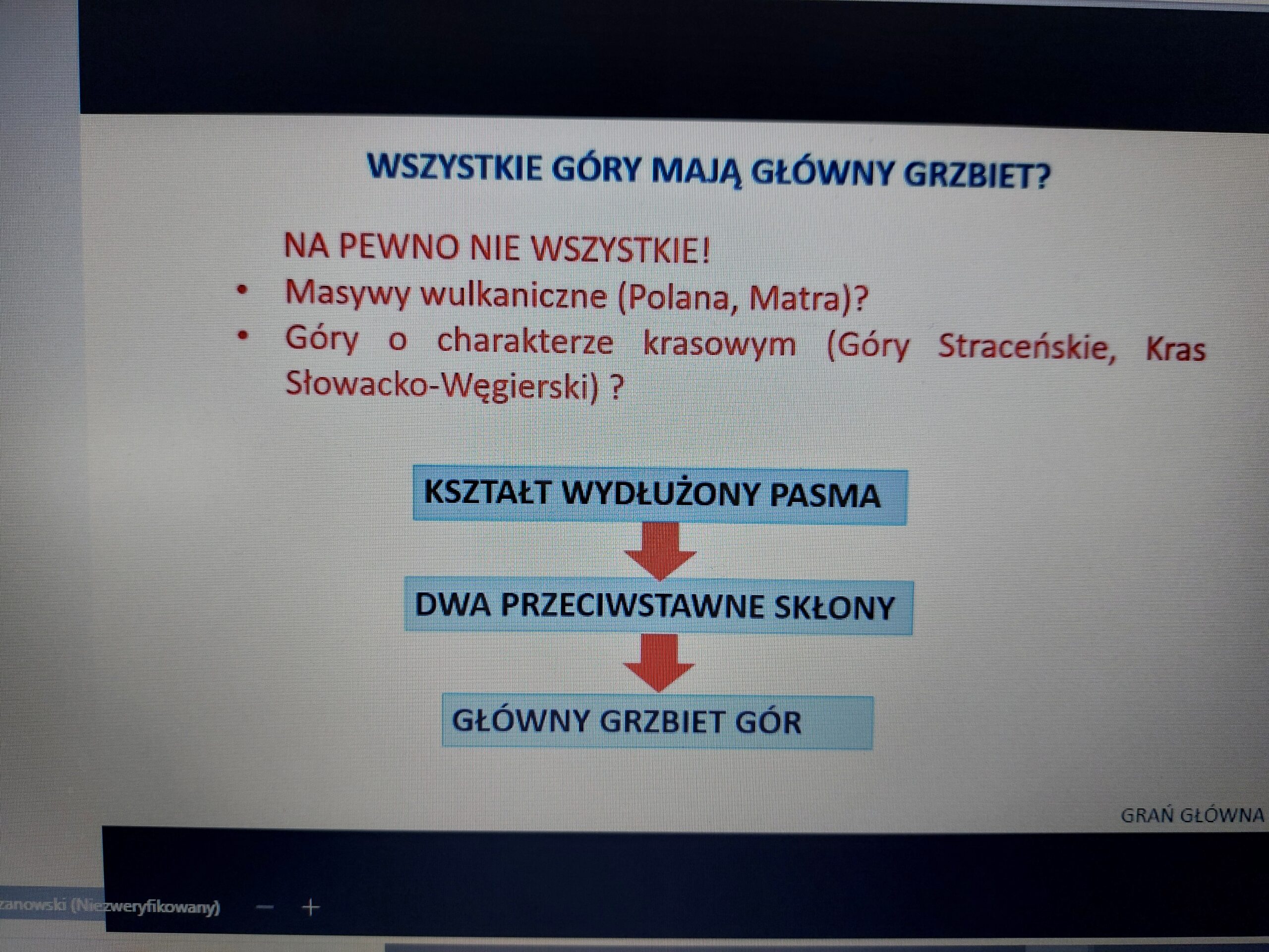 12 listopada 2024 roku uczniowie realizujący zakres rozszerzony geografii (2i, 3e, 4i), uczestniczyli w ramach współpracy I LO w oparciu o umowę partnerską z Instytutem Geografii i Gospodarki Przestrzennej UJ w Krakowie w kolejnym odczycie popularnonaukowym i dyskusji na temat :„Główna grań Tatr oczami krytycznego geografa”, poprowadzonej przez profesora Jarosława Balona (IGiGP UJ).