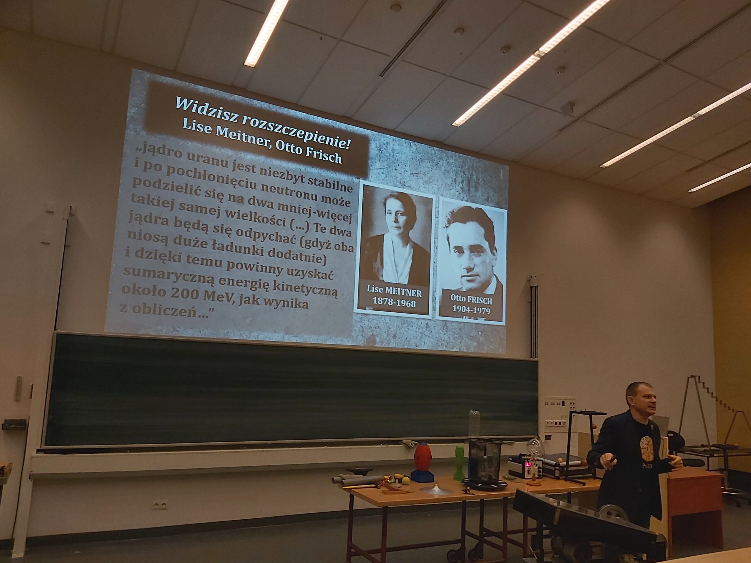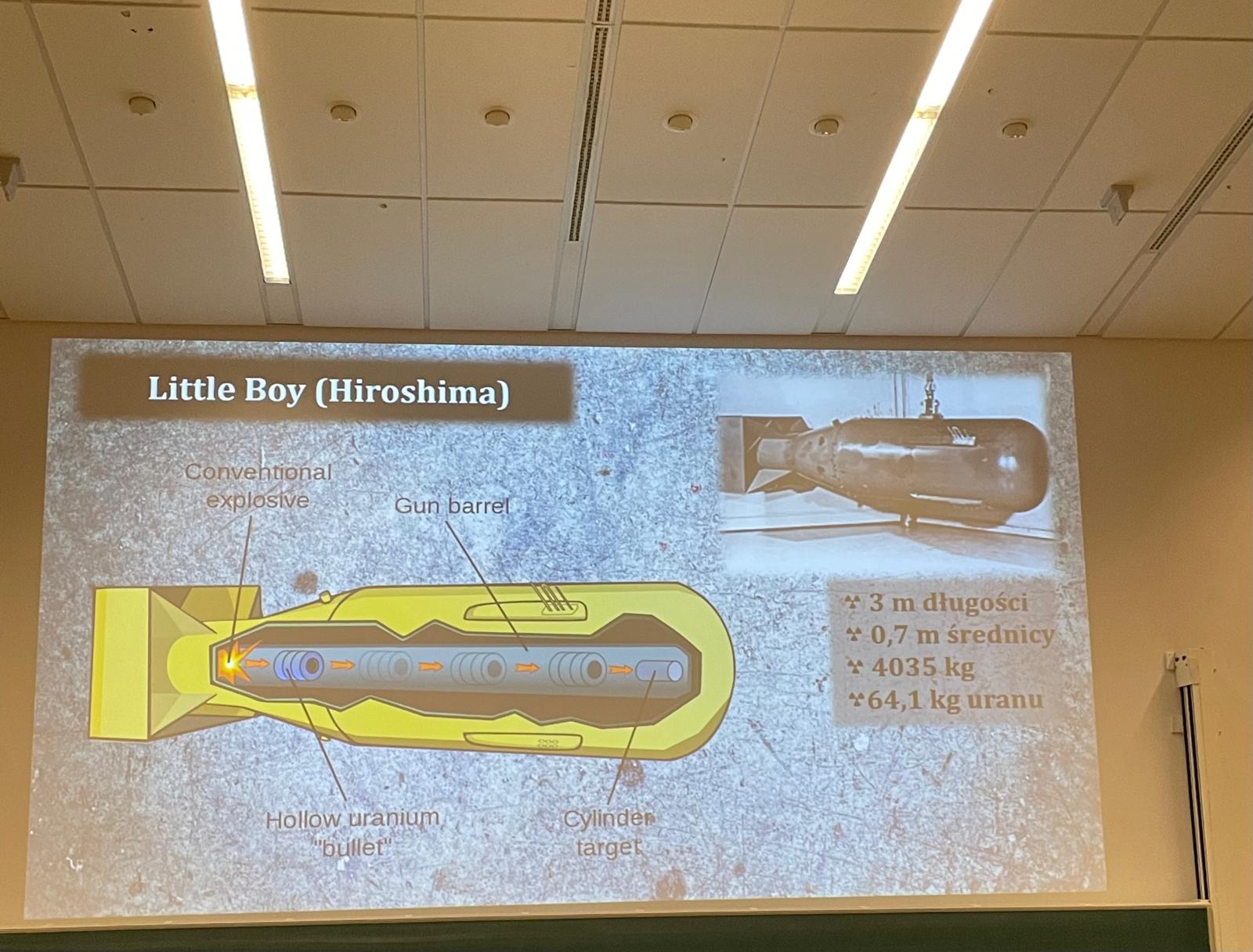 - Wykład dr. inż. Pawła Janowskiego pracownika naukowego Akademii Górniczo-Hutniczej w Krakowie pt. „Jak powstała bomba atomowa”, podczas którego uczniowie poznali podstawy fizyki jądrowej oraz kulisy Projektu Manhattan – jednego z najważniejszych osiągnięć naukowych XX wieku. Dr inż. Paweł Janowski w przystępny i fascynujący sposób wyjaśnił zagadnienia związane z fizyką jądrową, przedstawiając m.in. proces rozszczepienia jądra atomowego i jego zastosowanie w energetyce oraz w zbrojeniach. Uczniowie mieli okazję dowiedzieć się, jak naukowcy z różnych dziedzin współpracowali w ramach Projektu Manhattan, aby opracować pierwszą bombę jądrową, oraz jakie były konsekwencje tych badań dla świata.