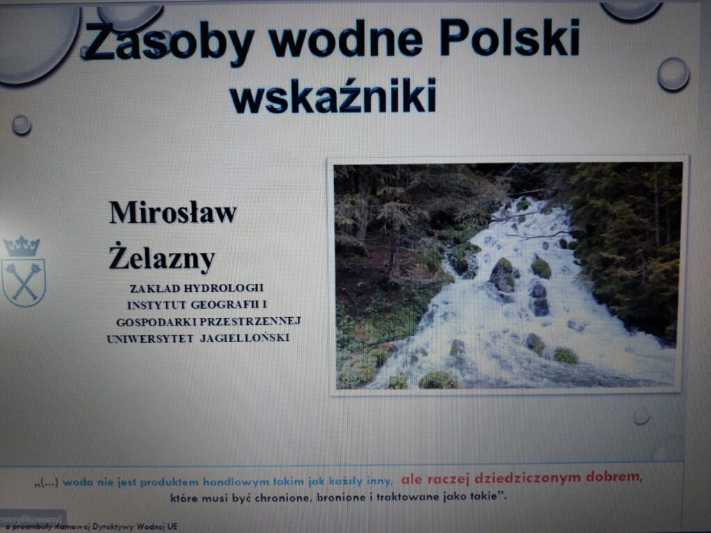 26 listopada 2024 roku uczniowie realizujący zakres rozszerzony geografii (2i, 3e, 4i), uczestniczyli w ramach współpracy I LO w oparciu o umowę partnerską z Instytutem Geografii i Gospodarki Przestrzennej UJ w Krakowie w kolejnym odczycie popularnonaukowym i dyskusji na temat :„Zasoby wodne Polski – wskaźniki”, poprowadzonej przez profesora Mirosława Żelaznego (IGiGP UJ).