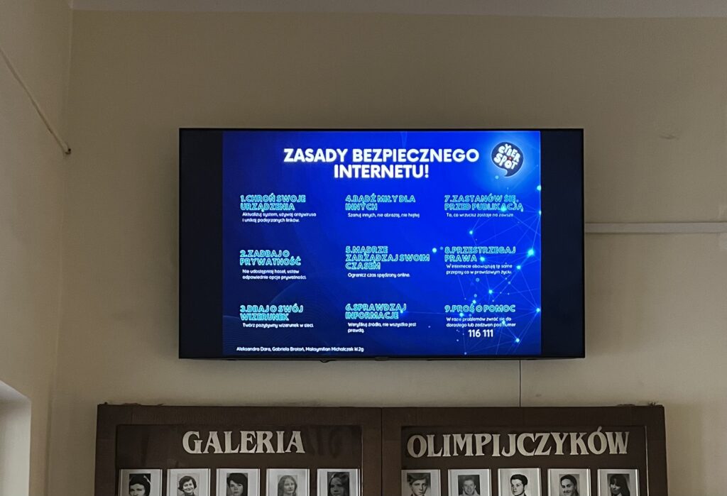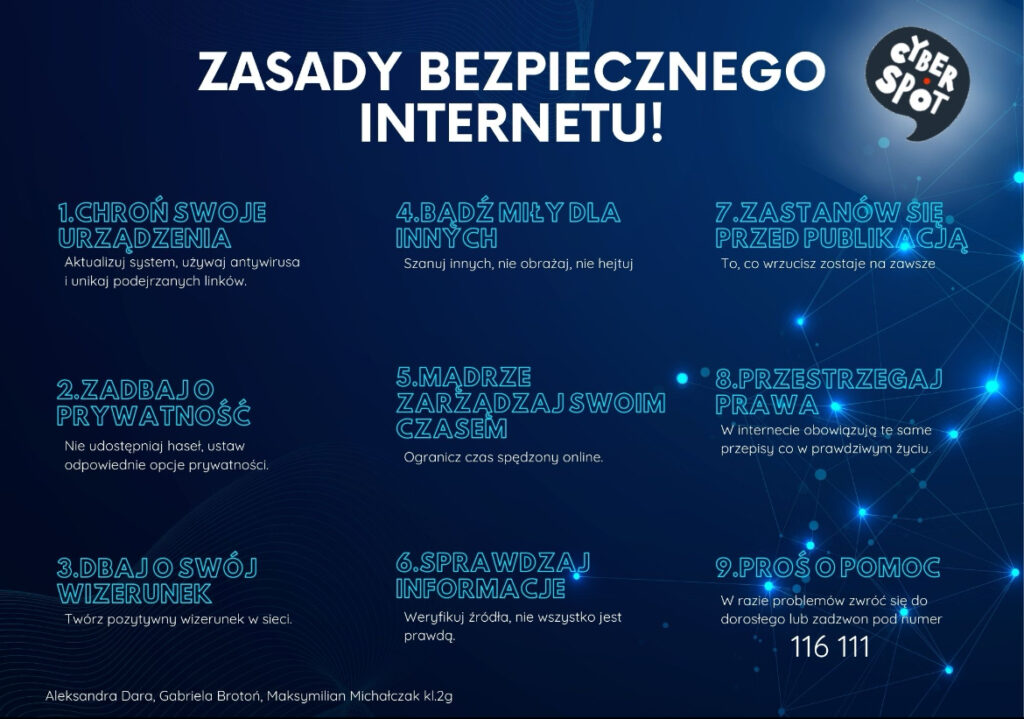 11 lutego 2025r. odbył się Dzień Bezpiecznego Internetu. Członkowie szkolnego zespołu CYBERspot – Aleksandra Dara, Gabriela Brotoń i Maksymilian Michałczak przygotowali plakat edukacyjny na temat zasad bezpiecznego korzystania z internetu.