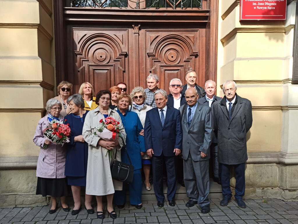 Jubileusz klasy B z lat 1971 – 1975 to wielkie wydarzenie w historii szkoły. Po 50 latach, 24 maja 2025 r. Absolwenci klasy śp. dr. Kazimierza Zająca i ich nauczyciele po uroczystej mszy św. w kościele św. Kazimierza w Nowym Sączu ponownie spotkali się w murach szkoły odbywając podróż sentymentalną do lat swojej młodości. Mieliśmy wielki zaszczyt i przyjemność gościć Państwa: Marzenę Dziunikowską, Agatę Golachowską, Małgorzatę Ignaczak, Stanisławę Maziarską, Marię Pękalę, Alicję Platę, Bogumiłę Potoniec, Marię Żuchowicz, Leszka Dubińskiego, Piotra Gryźlaka, Wacława Marańskiego, Tomasza Podgórskiego, Kazimierza Siedlarza i Jana Tischnera. Nie zabrakło Wspaniałych Nauczycieli: Reginy Czerneckiej, Michaliny Wójcik, Aliny Suwały, Marka Bieszczada. Dziękujemy za pamięć i więź ze szkołą, piękne wspomnienia o Wychowawcy, rozmowy i odtworzenie atmosfery sprzed wielu lat. Życzymy Państwu dużo zdrowia i liczymy na spotkanie przy następnym Jubileuszu.