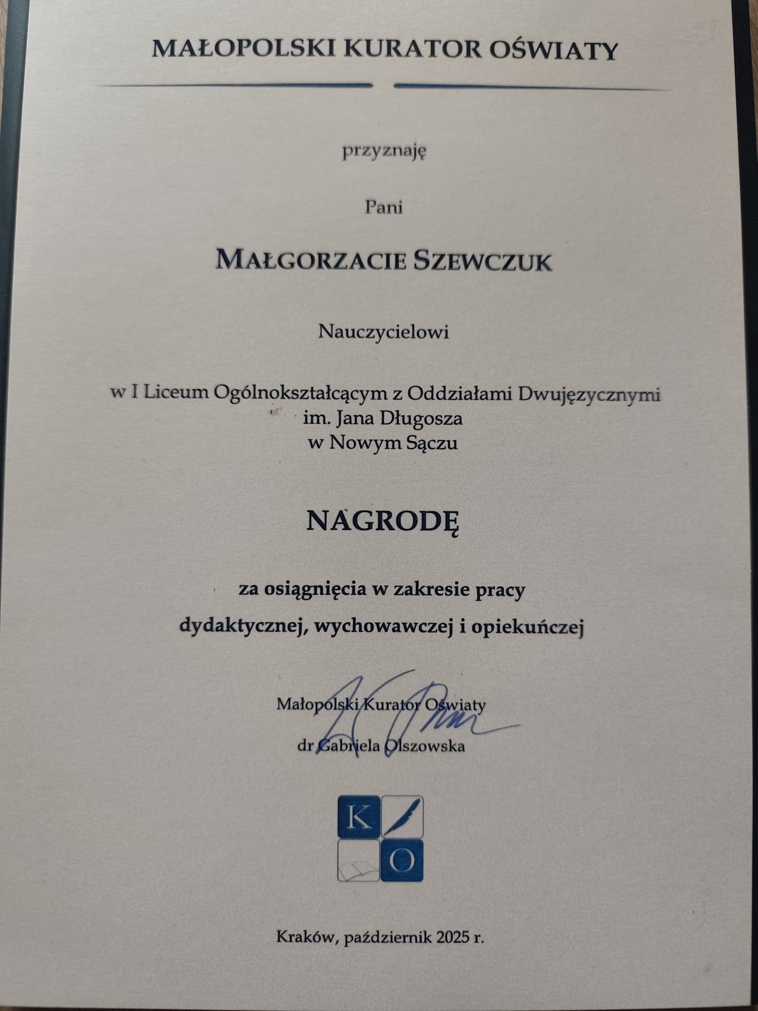 Miło nam poinformować, że w dowód uznania za osiągnięcia w zakresie pracy dydaktycznej, wychowawczej i opiekuńczej, w gronie wyróżnionych znalazła się przedstawicielka naszej szkoły-pani mgr Małgorzata Szewczuk.