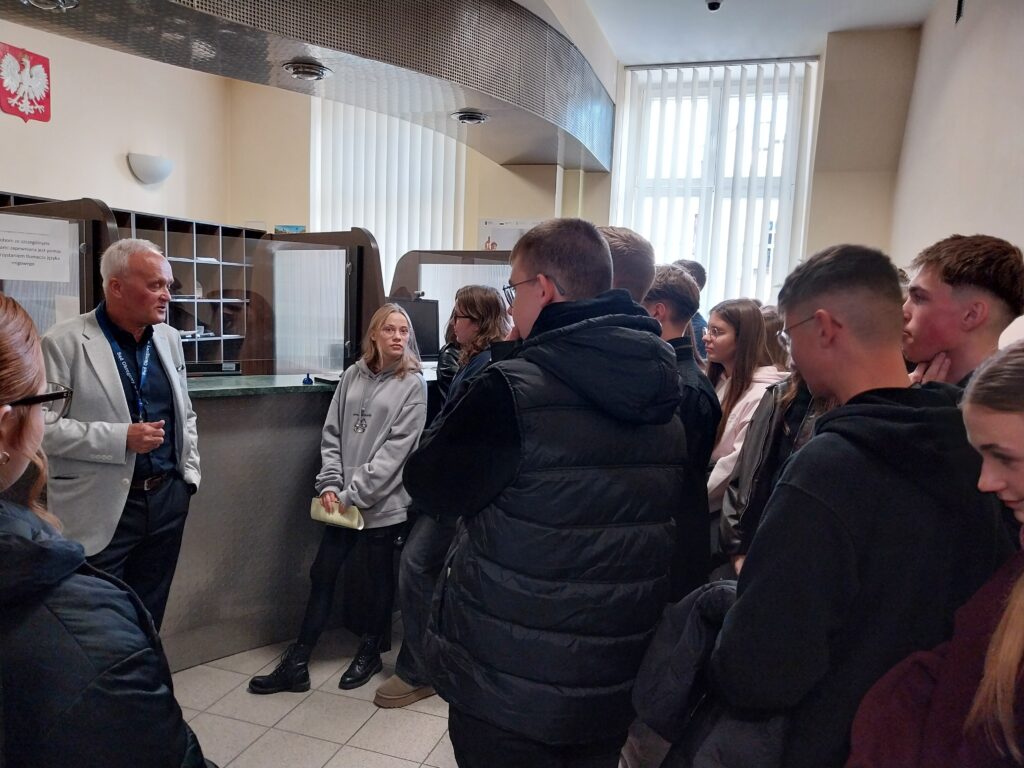 Ze względu na to, że uczniowie klasy pierwszej po raz pierwszy gościli w budynku Sądu Okręgowego, sędzia SO w st. spocz. Zbigniew Krupa oprowadził ich po całym gmachu, opowiadając o specyfice pracy sądu.