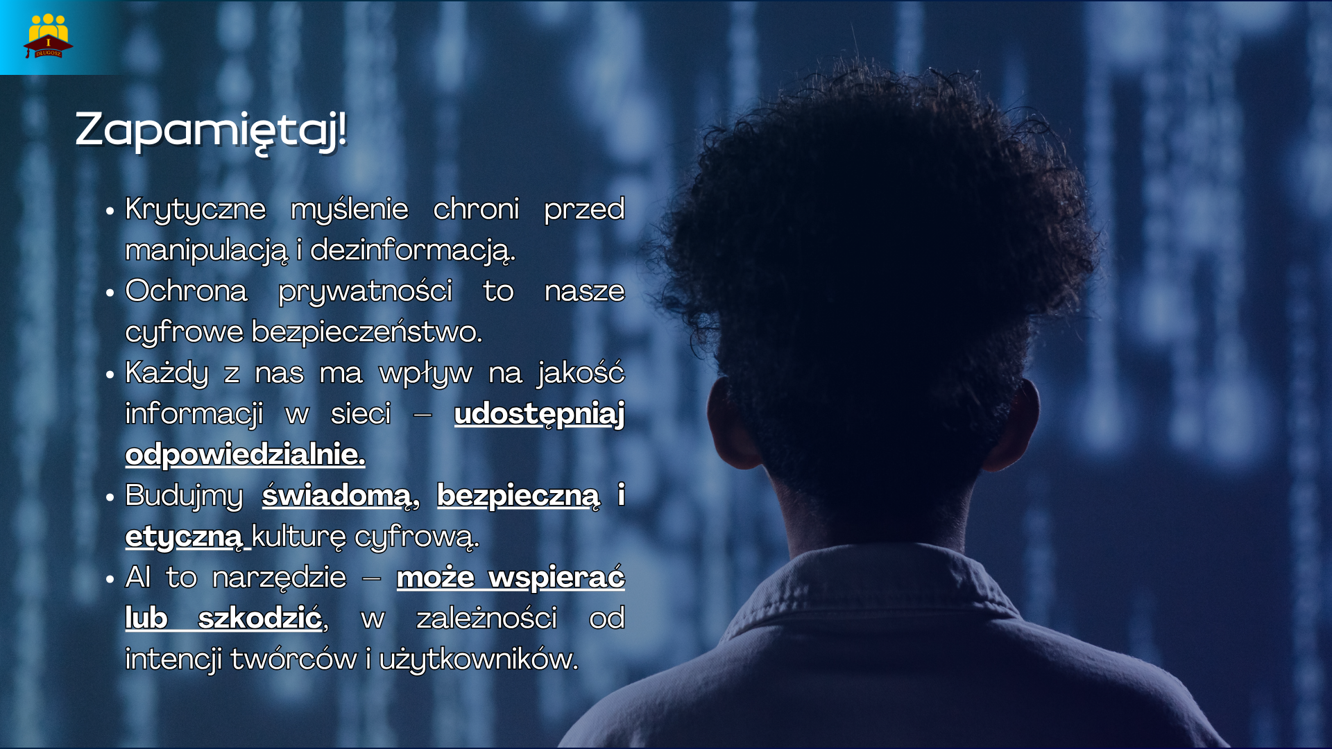 Pamiętajmy: „Nie wszystko, co widzimy w Internecie, jest prawdą.” Zanim uwierzymy w jakąkolwiek informację lub ją udostępnimy, musimy się zatrzymać i zadać sobie trzy podstawowe pytania: