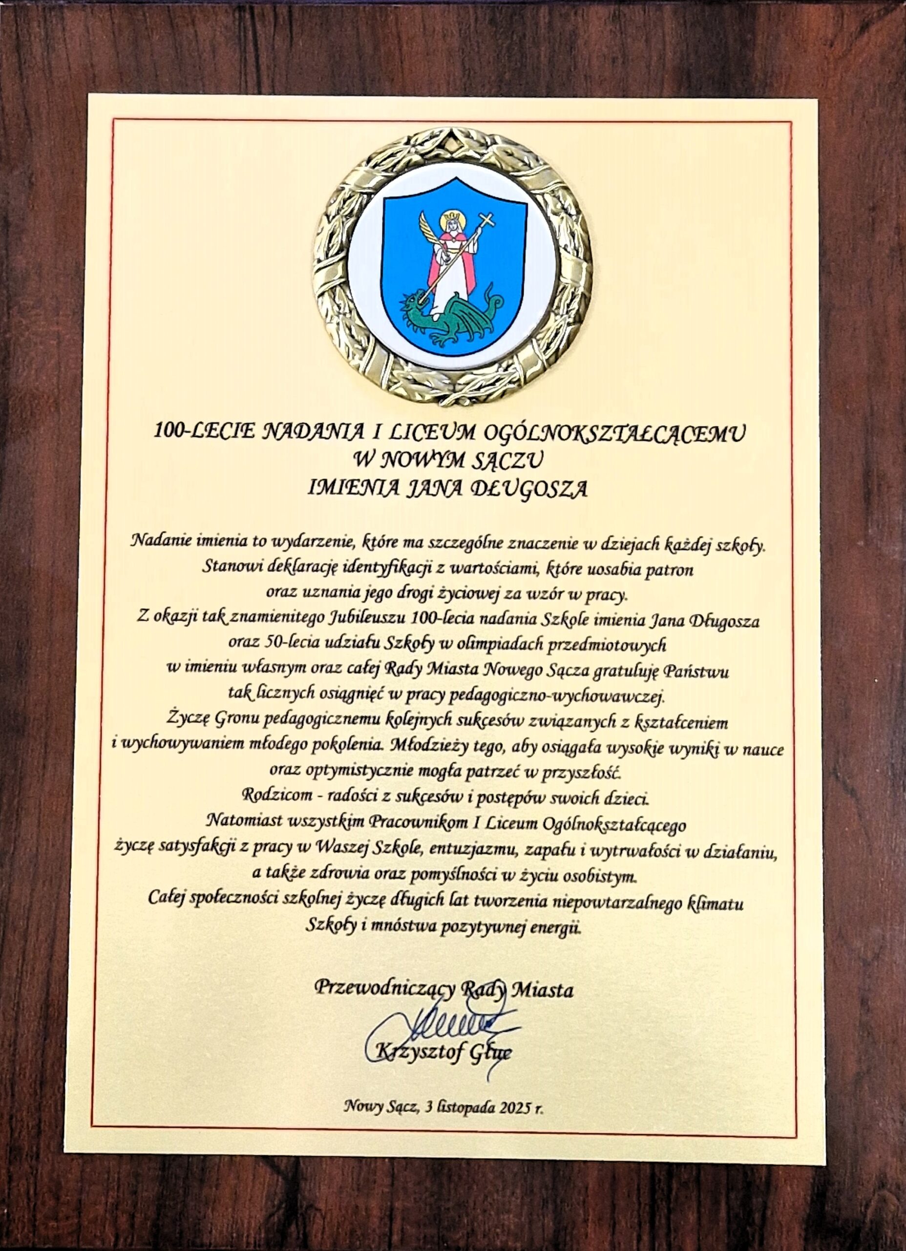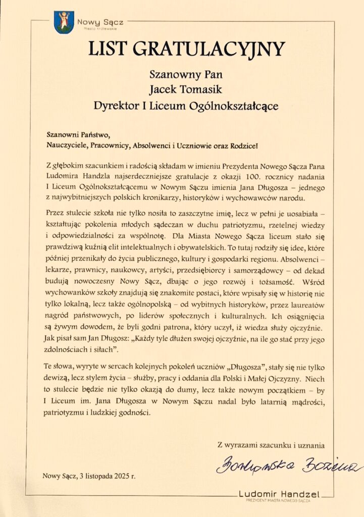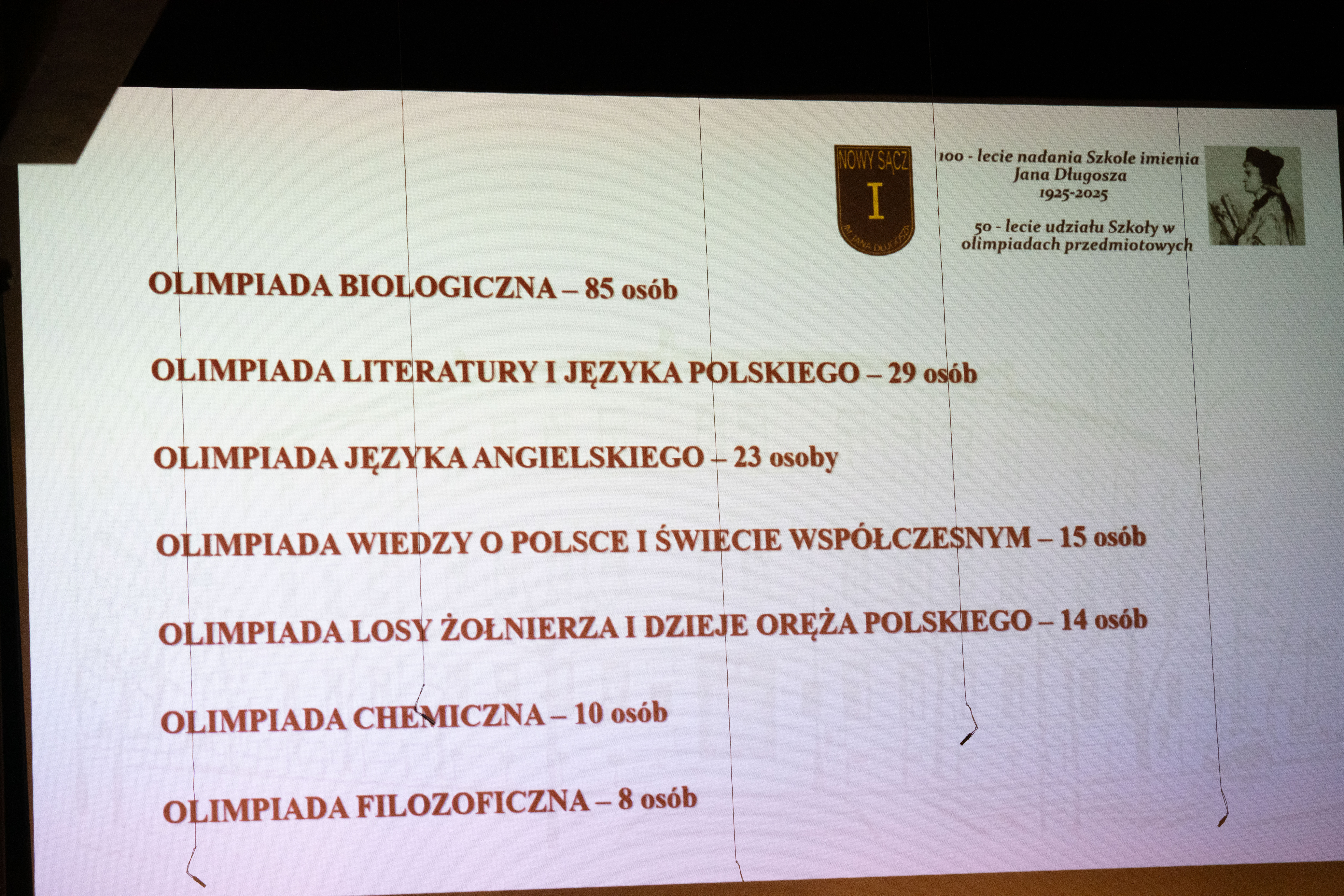 3 listopada 2025 rokuniewątpliwie zapisał się na kartach historii I Liceum Ogólnokształcącego im. Jana Długosza w Nowym Sączu jako dzień szczególny. Społeczność szkoły świętowała 207-lecie szkoły, połączone z dwoma wyjątkowymi jubileuszami: 100-leciem nadania szkole imienia Jana Długosza oraz 50-leciem udziału szkoły w olimpiadach przedmiotowych.