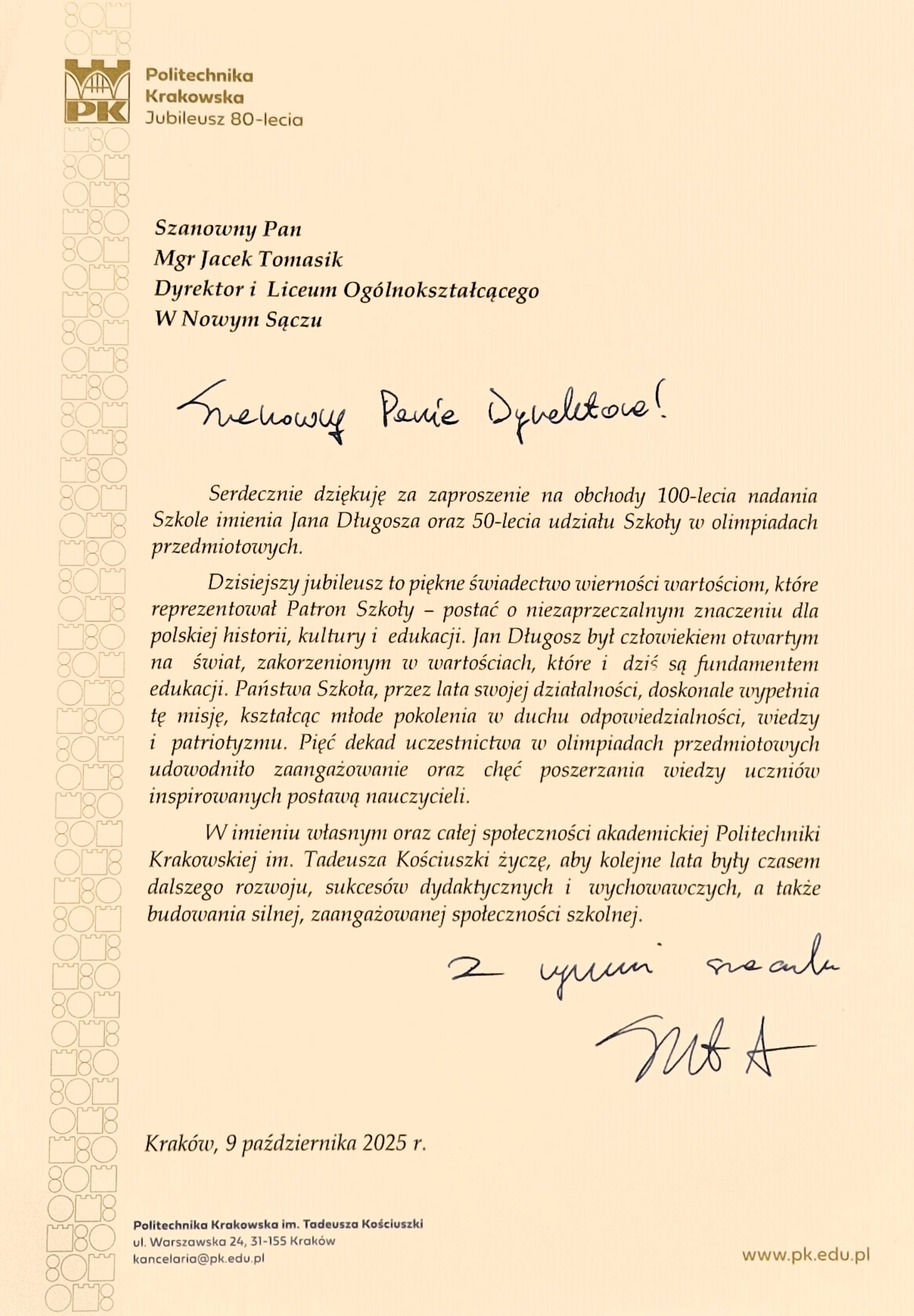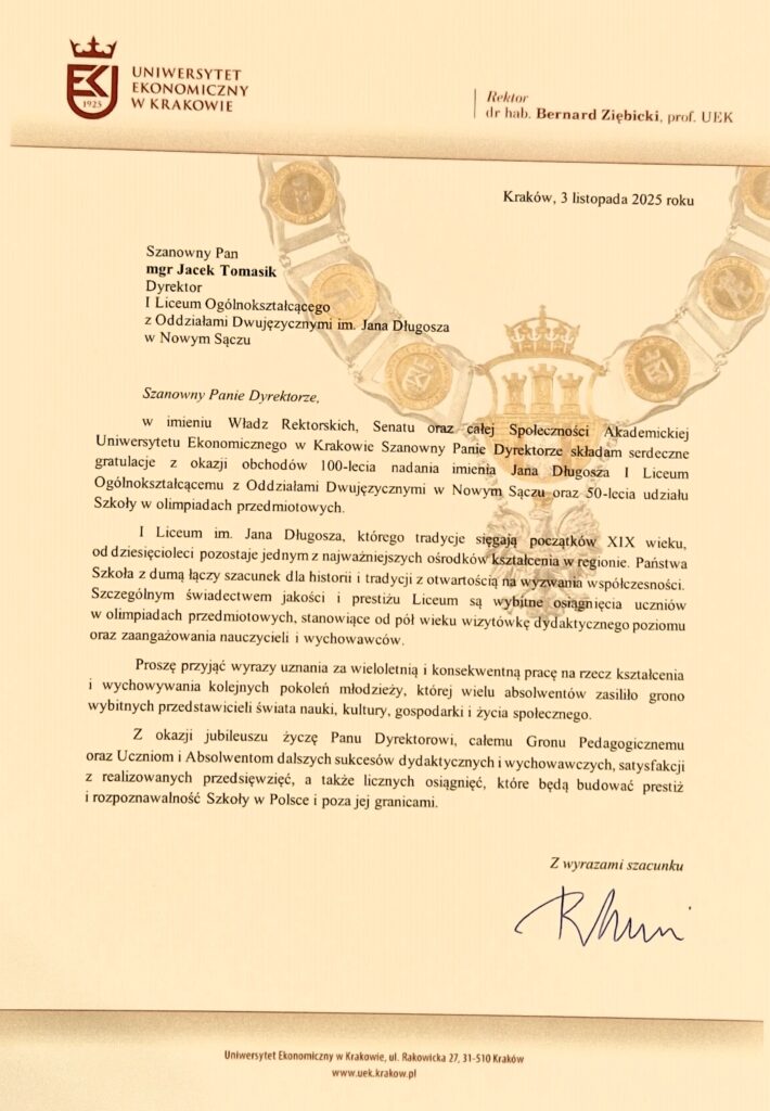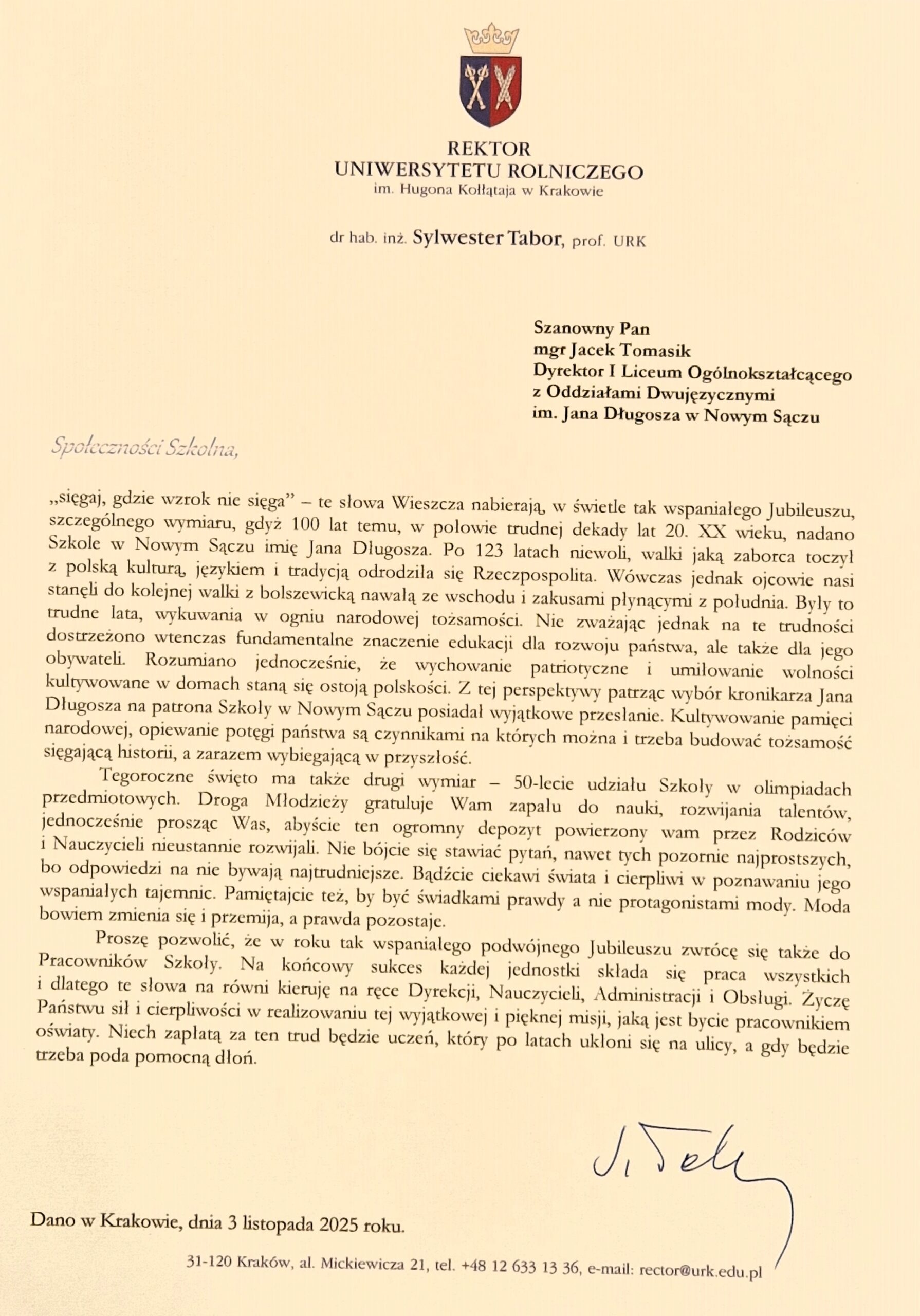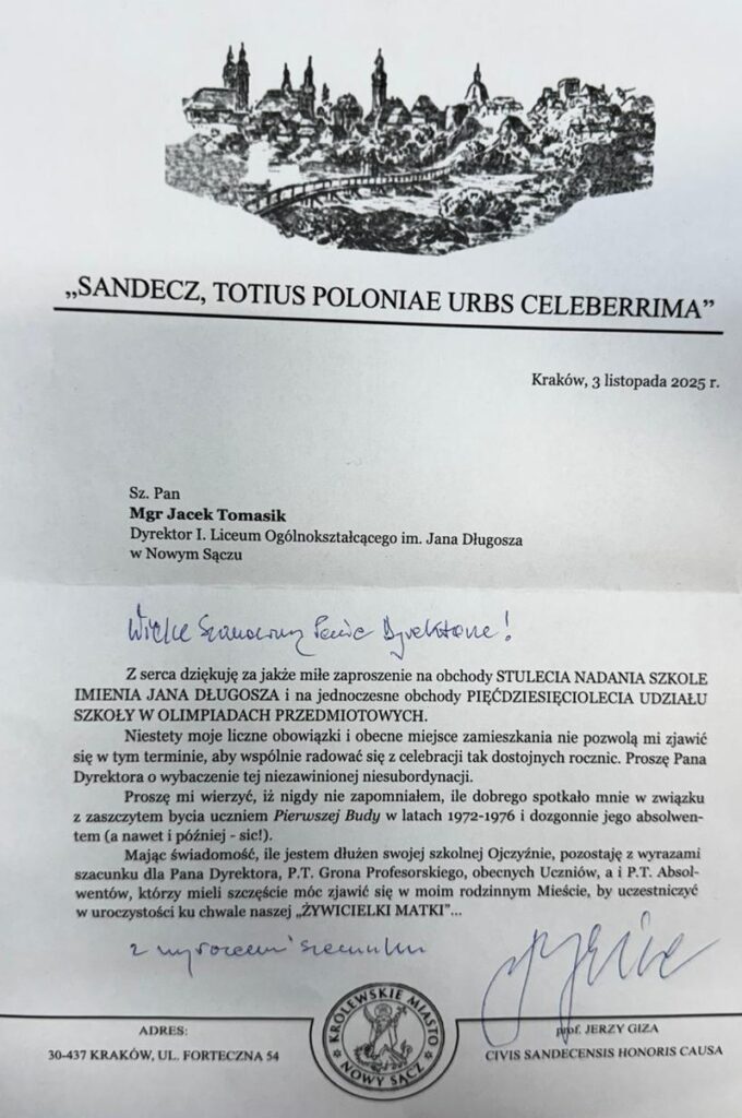 3 listopada 2025 rokuniewątpliwie zapisał się na kartach historii I Liceum Ogólnokształcącego im. Jana Długosza w Nowym Sączu jako dzień szczególny. Społeczność szkoły świętowała 207-lecie szkoły, połączone z dwoma wyjątkowymi jubileuszami: 100-leciem nadania szkole imienia Jana Długosza oraz 50-leciem udziału szkoły w olimpiadach przedmiotowych.