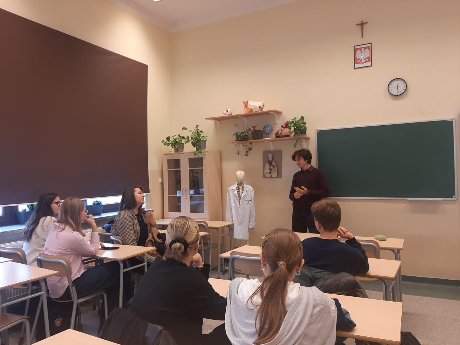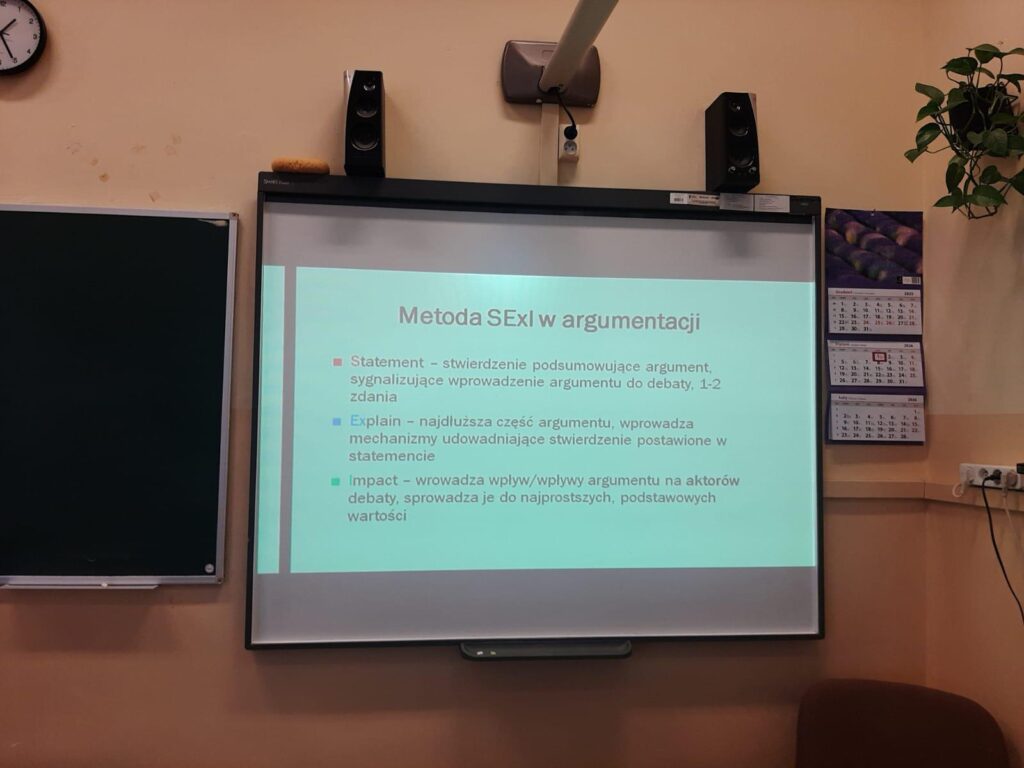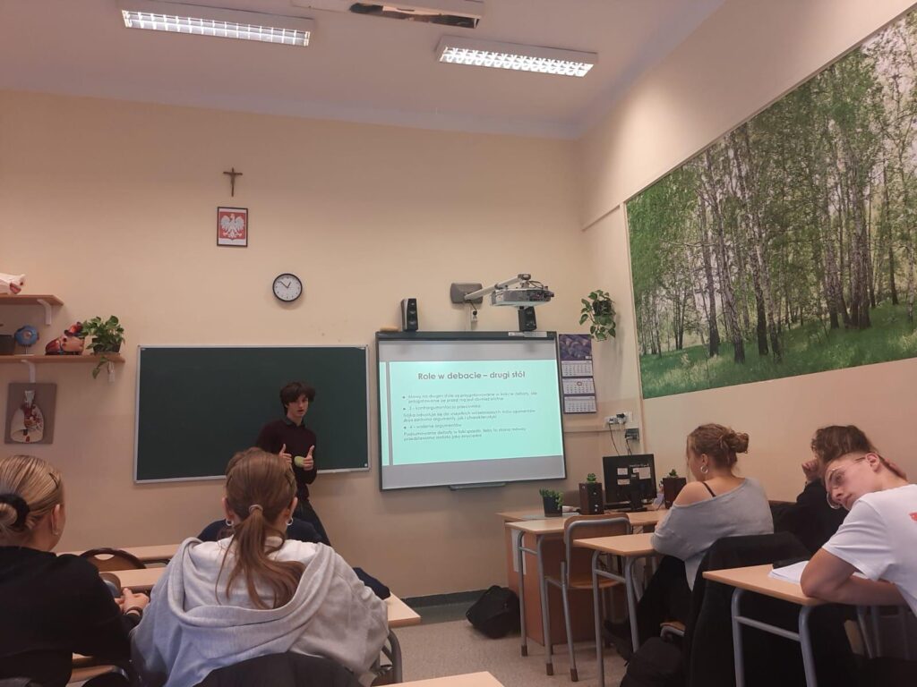 Zajęcia poprowadził doświadczony trener debat oksfordzkich – Pan Gustaw Szaszkiewicz, który wprowadził uczniów w zasady i strukturę debat, omówił role poszczególnych mówców oraz przedstawił kluczowe metody budowania argumentacji. Uczestnicy poznali m.in. technikę wnioskowania opartą na trzykrotnym zadawaniu pytania „dlaczego?”, a także metodę SExI (Statement – Explain – Illustrate), służącą prawidłowemu formułowaniu argumentów.