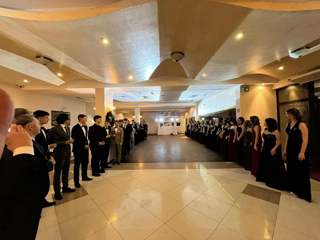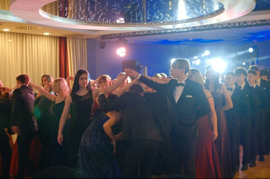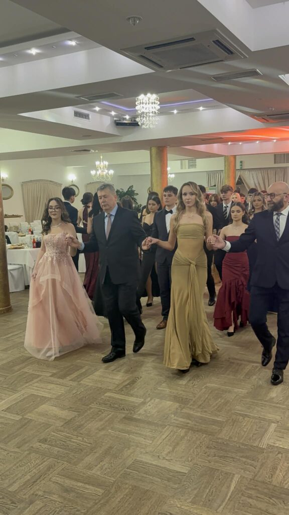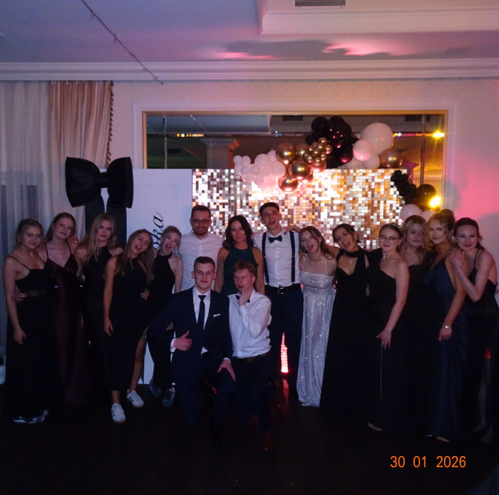 Po części oficjalnej parkiet szybko wypełnił się tańczącymi maturzystami. Starannie dobrana muzyka, energia i swobodna atmosfera sprawiły, że zabawa trwała do późnych godzin nocnych, a radość i entuzjazm uczestników doskonale oddawały wyjątkowy charakter tego studniówkowego wieczoru klasy 4b, wpisując go w ciąg kolejnych wydarzeń tegorocznego sezonu studniówek.