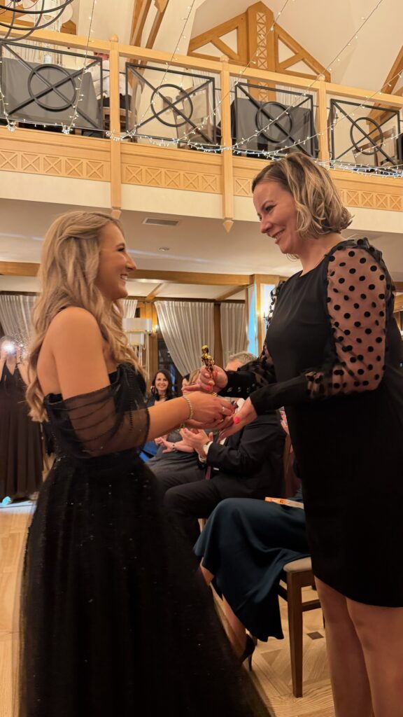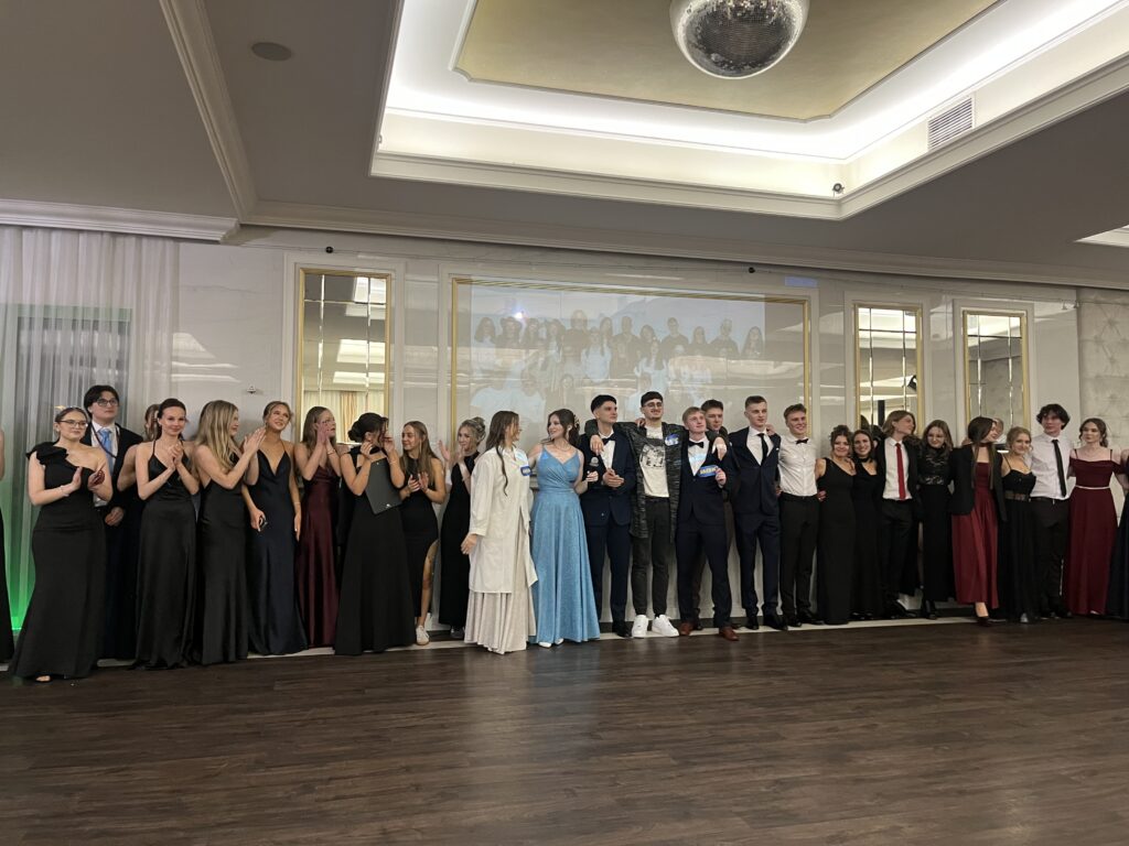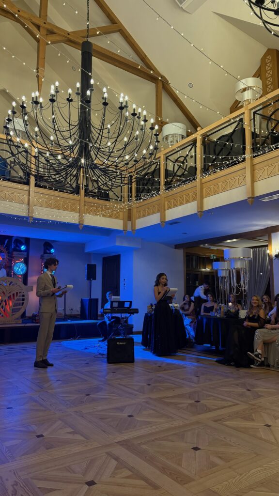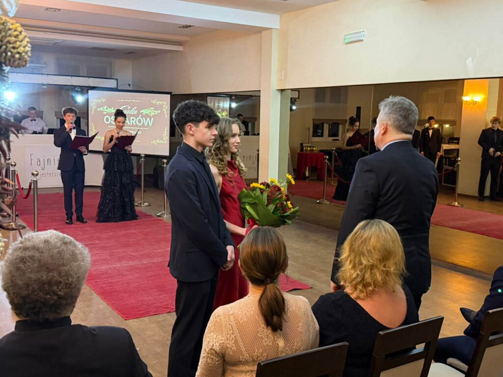 Część artystyczna wieczoru wprowadziła uczestników w nastrój refleksji i wspomnień. Przygotowany przez uczniów nostalgiczny film przypomniał najważniejsze momenty szkolnej codzienności, wywołując wzruszenie i uśmiechy. Nie zabrakło również gali Oscarów – tym razem w humorystycznym wydaniu, w którym statuetki trafiły do samych uczniów!