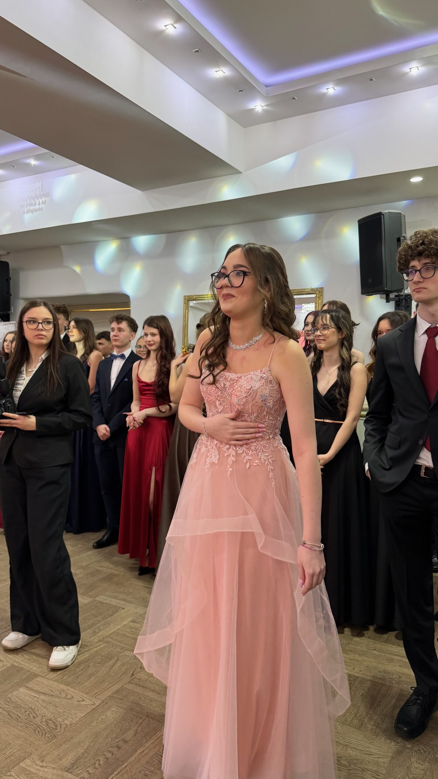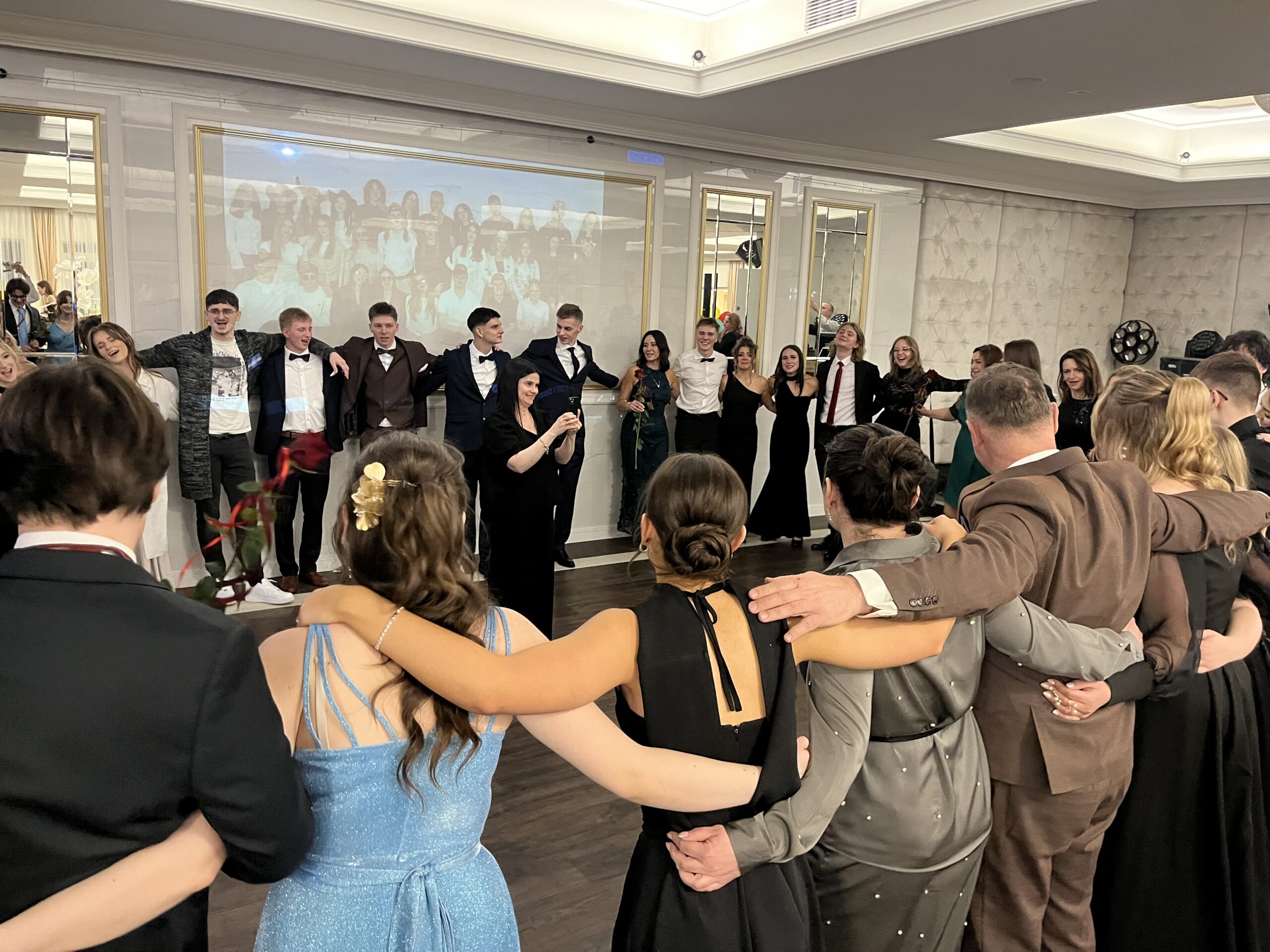 Po części oficjalnej parkiet szybko wypełnił się tańczącymi maturzystami. Starannie dobrana muzyka, energia i swobodna atmosfera sprawiły, że zabawa trwała do późnych godzin nocnych, a radość i entuzjazm uczestników doskonale oddawały wyjątkowy charakter tego studniówkowego wieczoru klasy 4b, wpisując go w ciąg kolejnych wydarzeń tegorocznego sezonu studniówek.