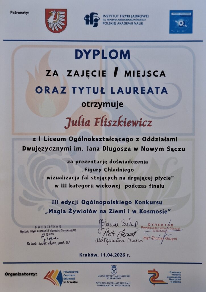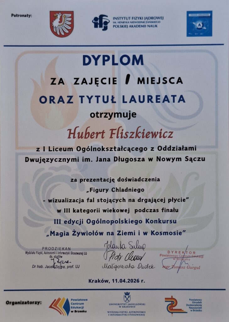 Z radością informujemy, że Julia Fliszkiewicz (kl. 3e) oraz Hubert Fliszkiewicz (kl. 1a) zdobyli I miejsce oraz tytuł laureatów w III edycji Ogólnopolskiego Konkursu „Magia Żywiołów na Ziemi i w Kosmosie”.